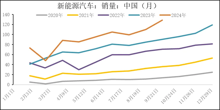 据中国汽车工业协会数据显示,2024年9月,新能源汽车产销分别完成130.7万辆和128.7万辆,同比分别增长48.8%和42.3%。2024年1-9月,新能源汽车产销分别完成831.6万辆和832万辆,同比分别增长31.7%和32.5%。2024年9月,新能源汽车国内销量117.6万辆,环比增长18.8%,同比增长45.5%。2024年1-9月,新能源汽车国内销量739.2万辆,同比增长35.6%。2024年9月,新能源汽车出口11.1万辆,环比增长0.9%,同比增长15.6%。2024年1-9月,新能源汽车出口92.8万辆,同比增长12.5%。
