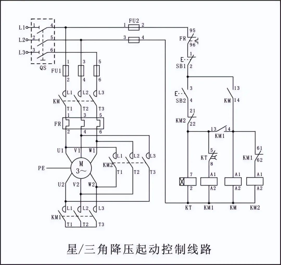 经典的星三角降压启动,虽然比不上软启动,但是应用还是很广的。一个主接触器,一个星接触器,一个角接触器。通过时间继电器,实现星角自动转换的目的。