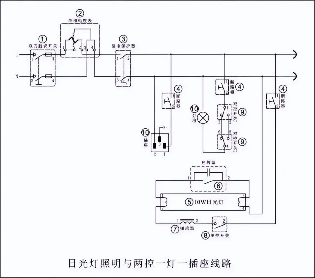 里面包含②单相电表的接线,两个⑨和一个⑩是一灯双控的接线,⑤⑥⑦⑧为日光灯的接线。这个电路非常的实用,是家装照明控制的经典案列。