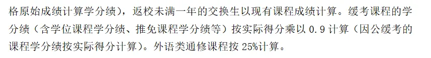 缓考课程的学分绩(含学位课程学分绩、推免课程学分绩等)按实际得分乘以0.9计算(因公缓考的课程学分绩按实际得分计算)。外语类通修课程按25%计算。