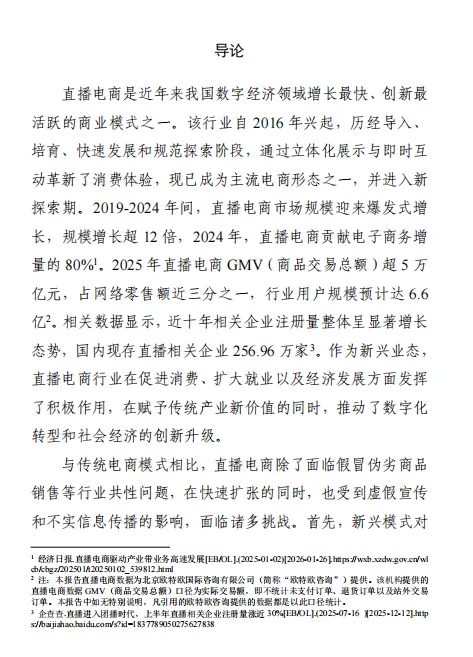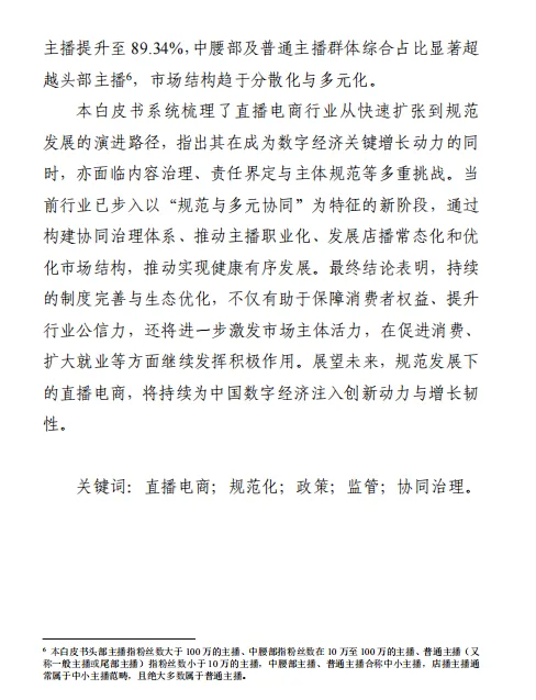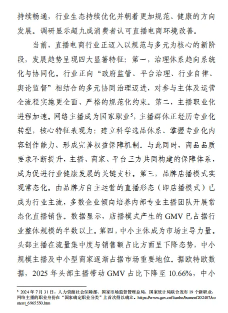 市场监管局《2025 直播电商行业发展白皮书》核心结论:直播电商已迈入 “规范协同 + 多元共生” 新阶段,2025 年 GMV 超 5.2 万亿元,占网络零售额近 1/3,中小主播与品牌店播主导市场(GMV 占比 89.34%),“政府监管 + 平台治理 + 行业自律 + 舆论监督” 的多元治理体系成效显著,商品质量与消费信任稳步提升,职业化、规范化、数智化成为行业核心发展方向。