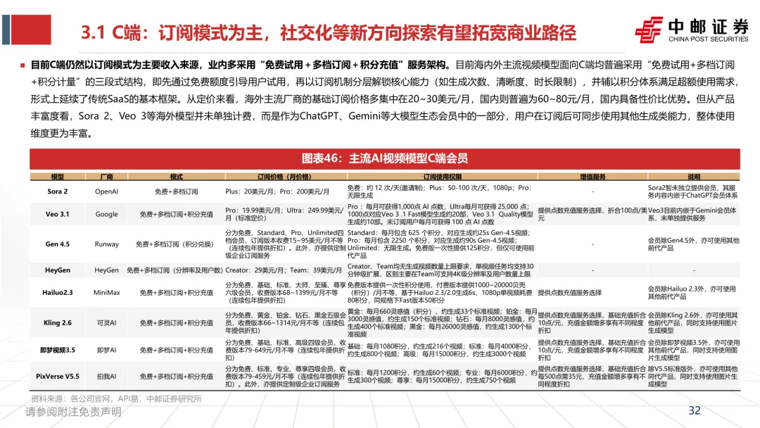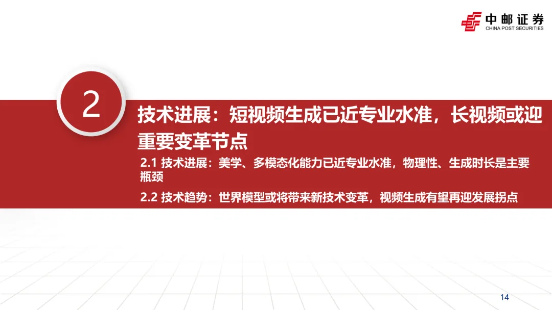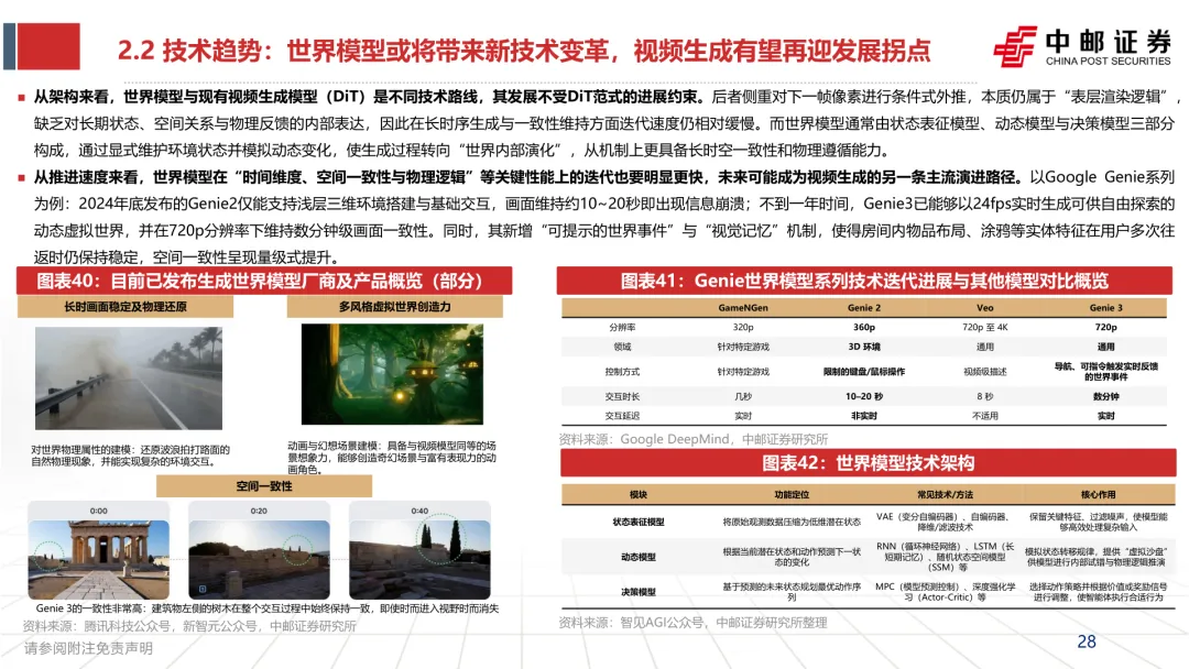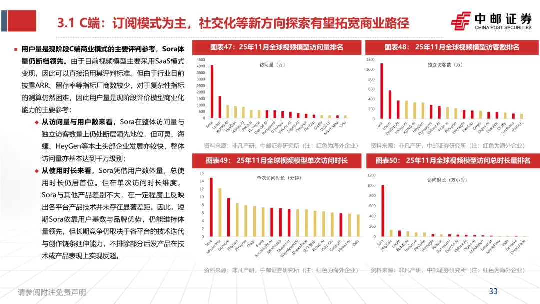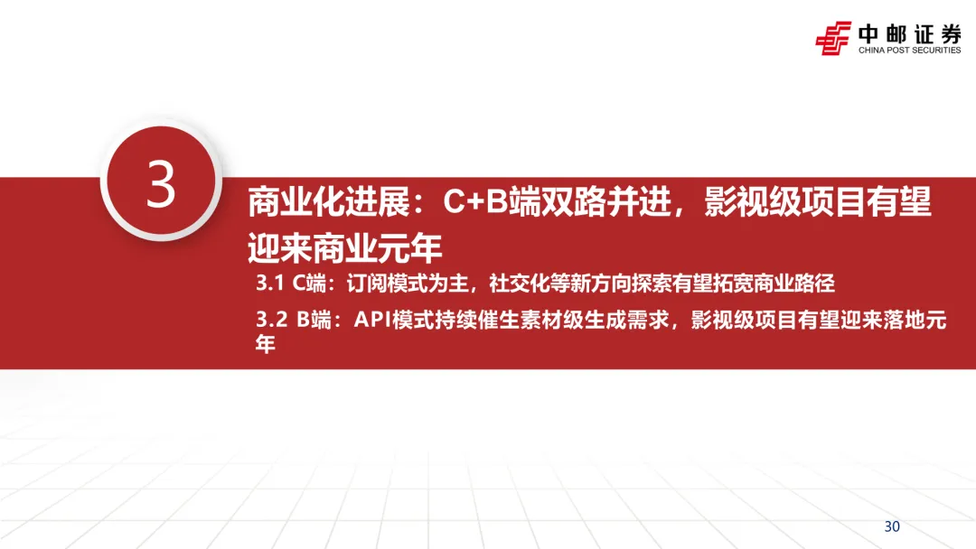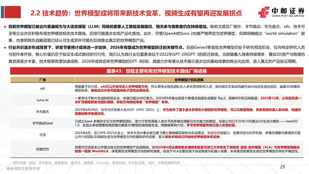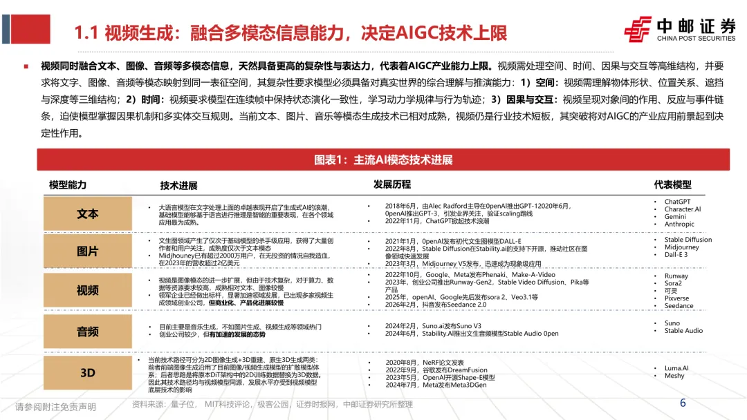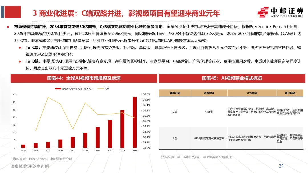 导读:报告聚焦 AI 视频行业发展态势,剖析技术跃迁与产业变革机遇。AI 视频作为 AIGC 产业能力上限的核心载体,技术路线已从 GAN、Transformer 逐步收敛至 DiT 架构,Sora 等标杆模型推动短视频生成质量接近专业水准,音画一体化成为重要演进方向。商业化呈现 C+B 端双轮驱动格局,2026 年全球市场规模预计达 2.96 亿美元。C 端以订阅模式为主,社交化探索拓宽变现路径;B 端 API 模式在电商、广告等场景成熟,影视级项目逐步落地,2026 年有望成为商业化关键节点。世界模型作为新兴技术方向,正破解长视频生成的物理一致性与时长瓶颈,为行业带来新突破。应用场景深度渗透传媒领域,广告、影视、游戏均受益显著。AI 助力广告内容批量生产,推动影视短剧降本增效,赋能游戏资产制作与玩法创新,成为内容产业生产力变革的核心引擎。