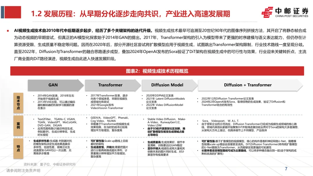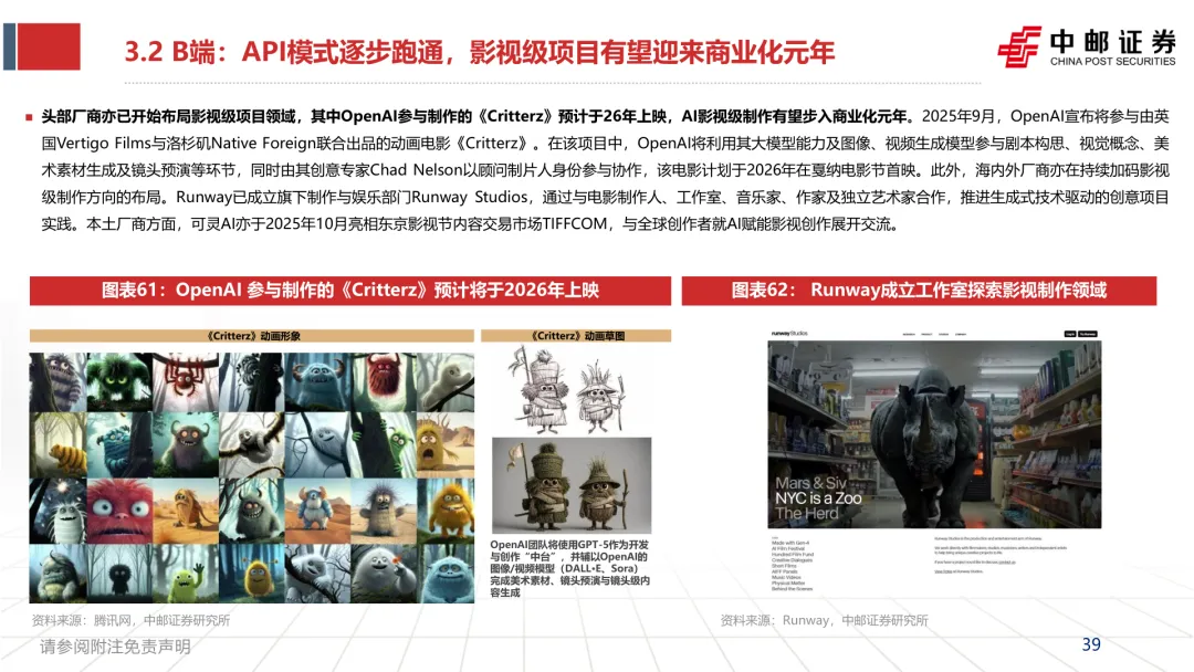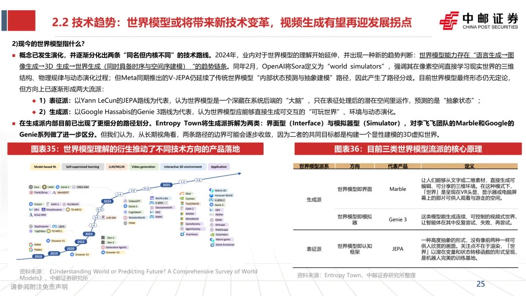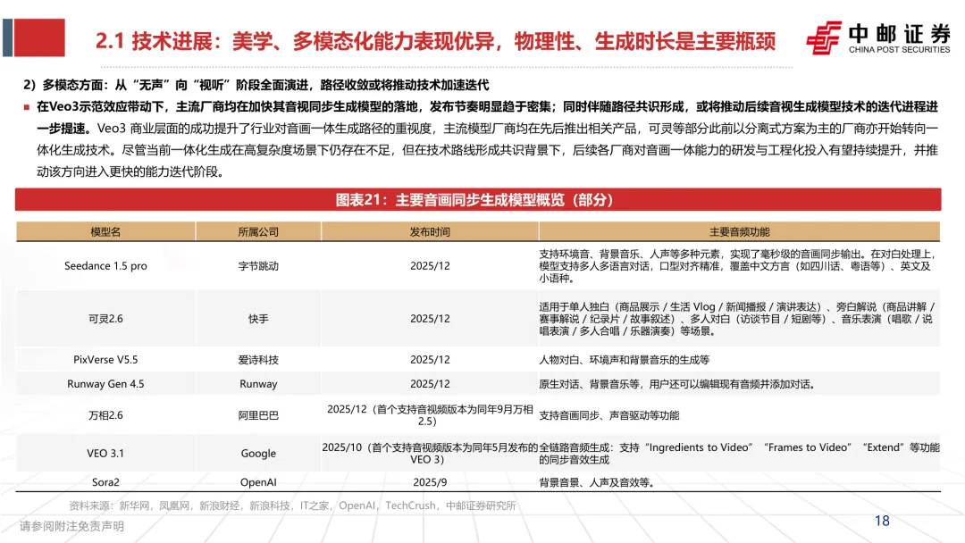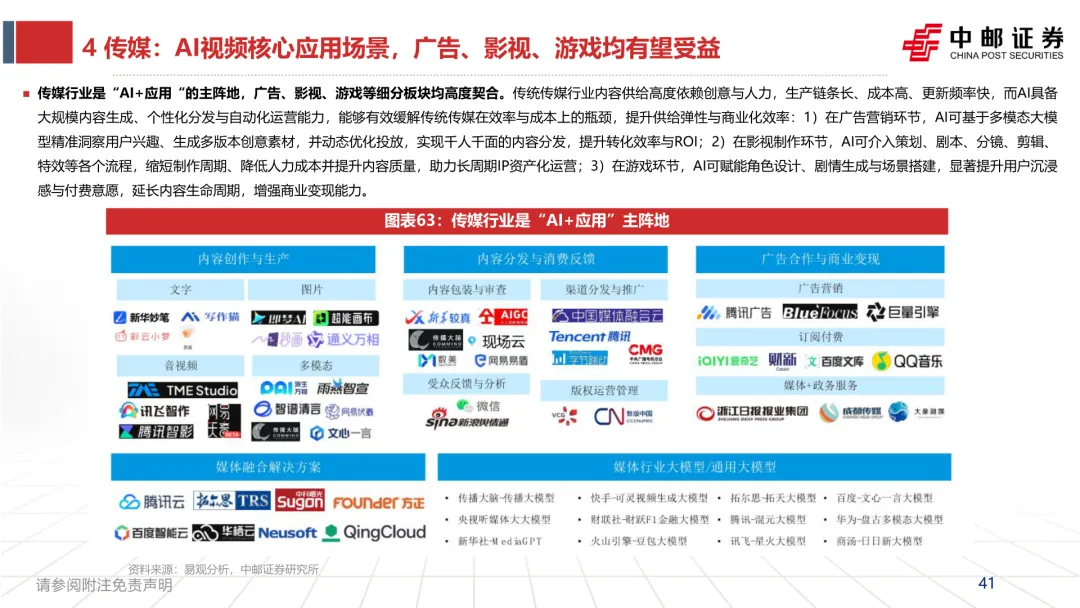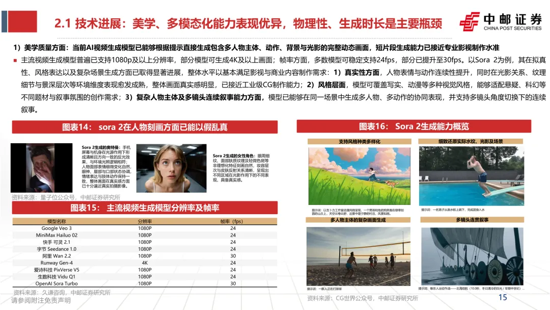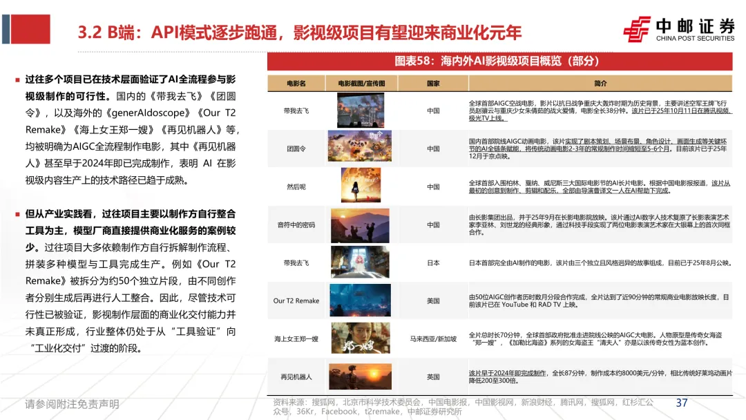 导读:报告聚焦 AI 视频行业发展态势,剖析技术跃迁与产业变革机遇。AI 视频作为 AIGC 产业能力上限的核心载体,技术路线已从 GAN、Transformer 逐步收敛至 DiT 架构,Sora 等标杆模型推动短视频生成质量接近专业水准,音画一体化成为重要演进方向。商业化呈现 C+B 端双轮驱动格局,2026 年全球市场规模预计达 2.96 亿美元。C 端以订阅模式为主,社交化探索拓宽变现路径;B 端 API 模式在电商、广告等场景成熟,影视级项目逐步落地,2026 年有望成为商业化关键节点。世界模型作为新兴技术方向,正破解长视频生成的物理一致性与时长瓶颈,为行业带来新突破。应用场景深度渗透传媒领域,广告、影视、游戏均受益显著。AI 助力广告内容批量生产,推动影视短剧降本增效,赋能游戏资产制作与玩法创新,成为内容产业生产力变革的核心引擎。