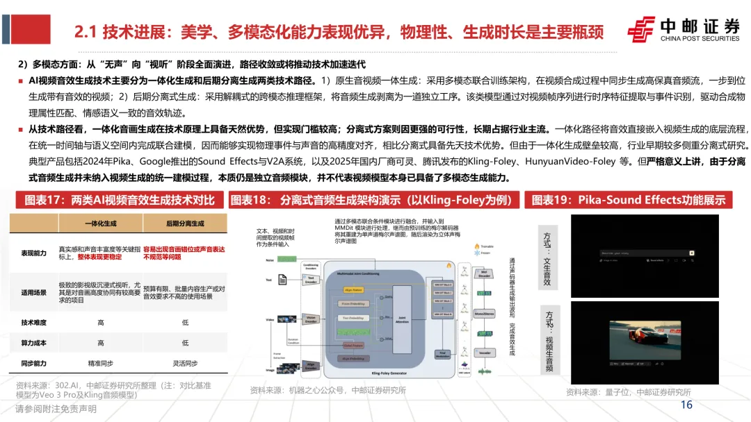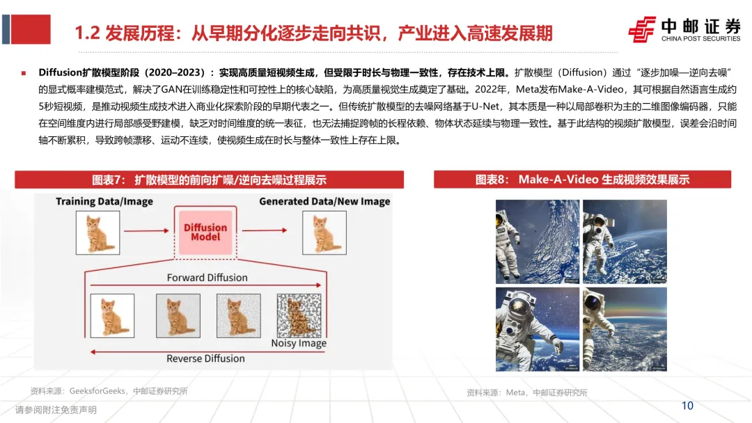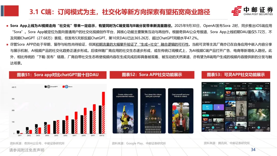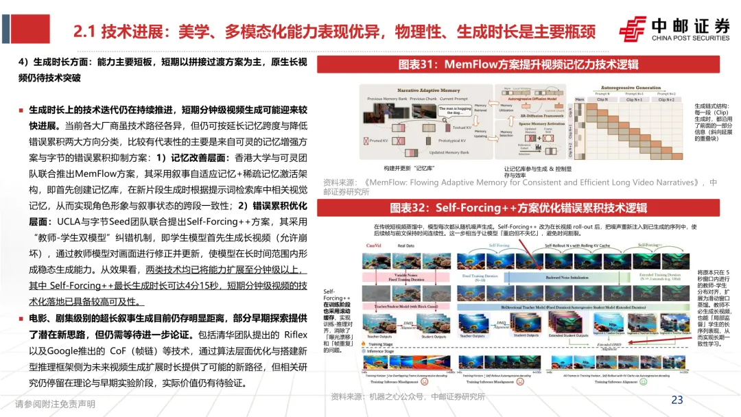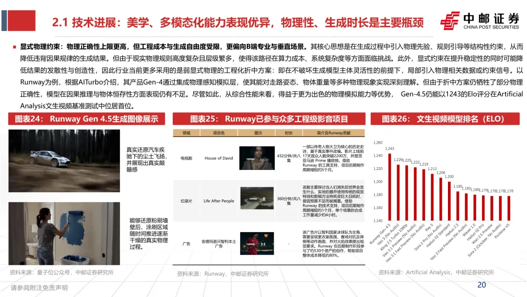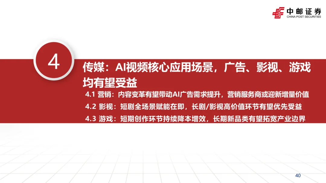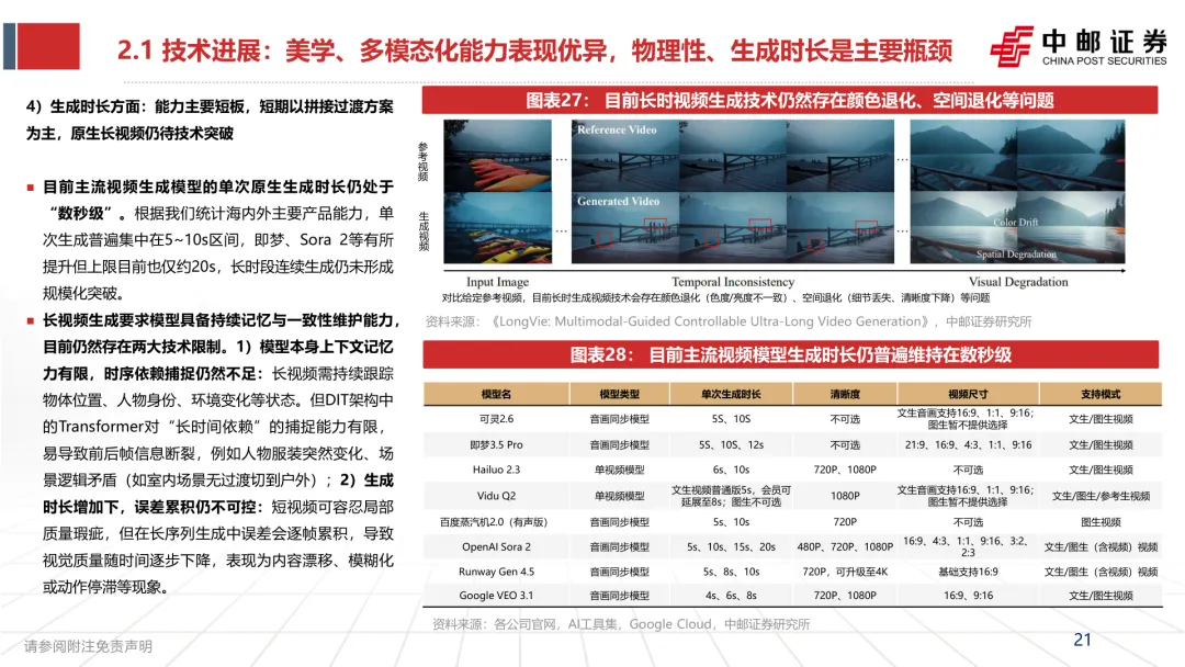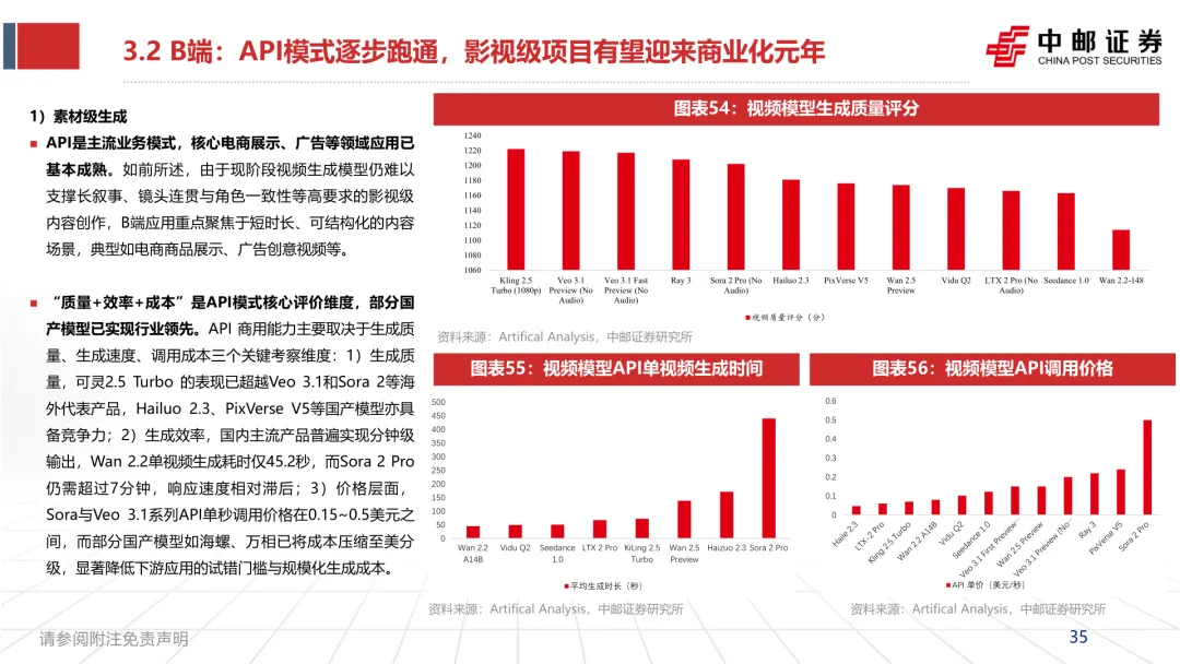 导读:报告聚焦 AI 视频行业发展态势,剖析技术跃迁与产业变革机遇。AI 视频作为 AIGC 产业能力上限的核心载体,技术路线已从 GAN、Transformer 逐步收敛至 DiT 架构,Sora 等标杆模型推动短视频生成质量接近专业水准,音画一体化成为重要演进方向。商业化呈现 C+B 端双轮驱动格局,2026 年全球市场规模预计达 2.96 亿美元。C 端以订阅模式为主,社交化探索拓宽变现路径;B 端 API 模式在电商、广告等场景成熟,影视级项目逐步落地,2026 年有望成为商业化关键节点。世界模型作为新兴技术方向,正破解长视频生成的物理一致性与时长瓶颈,为行业带来新突破。应用场景深度渗透传媒领域,广告、影视、游戏均受益显著。AI 助力广告内容批量生产,推动影视短剧降本增效,赋能游戏资产制作与玩法创新,成为内容产业生产力变革的核心引擎。