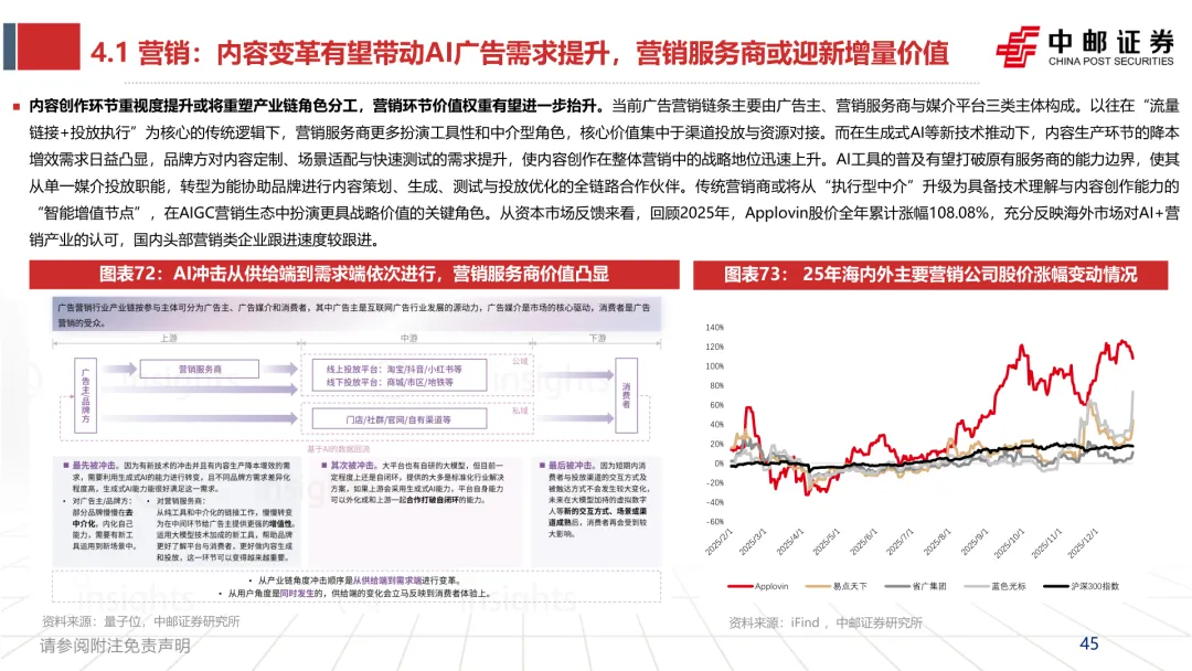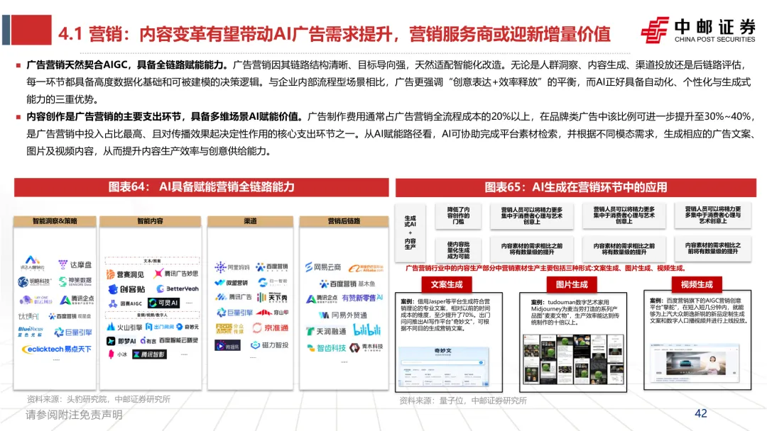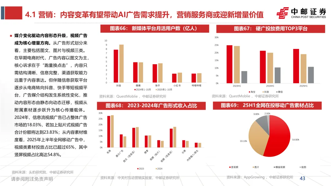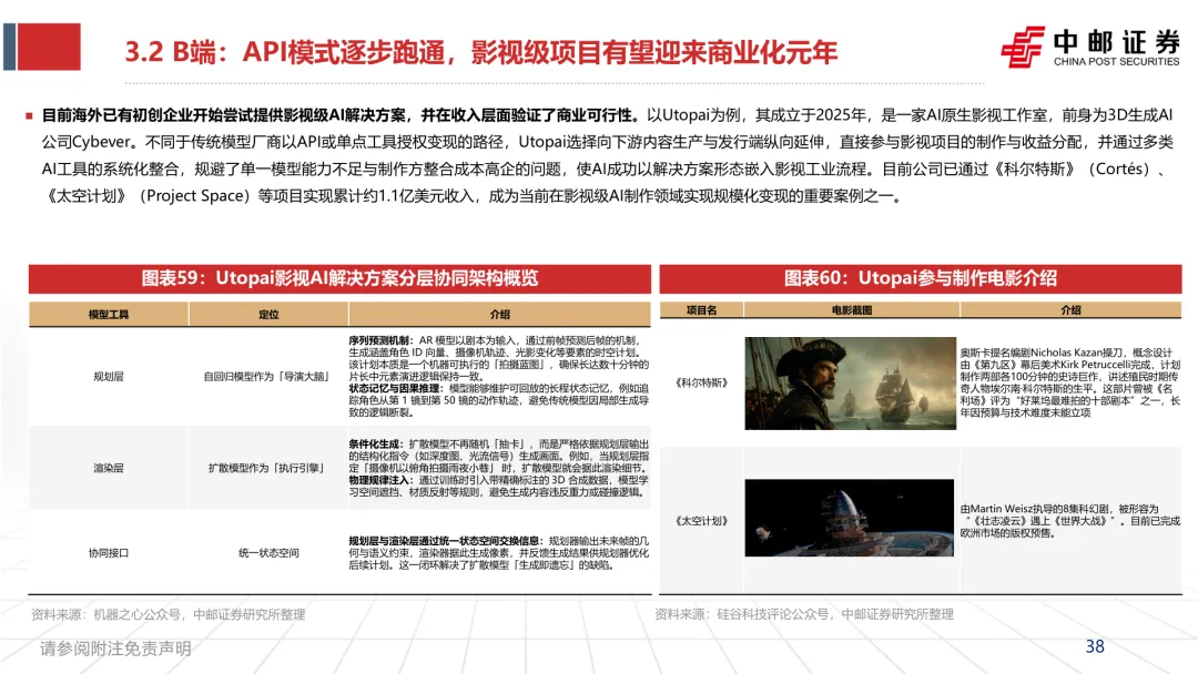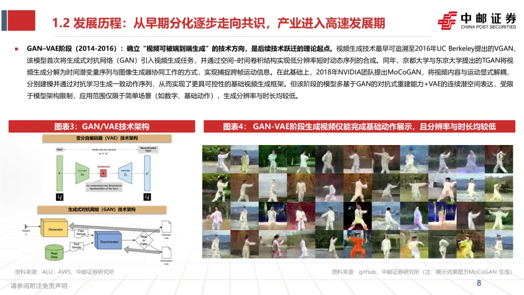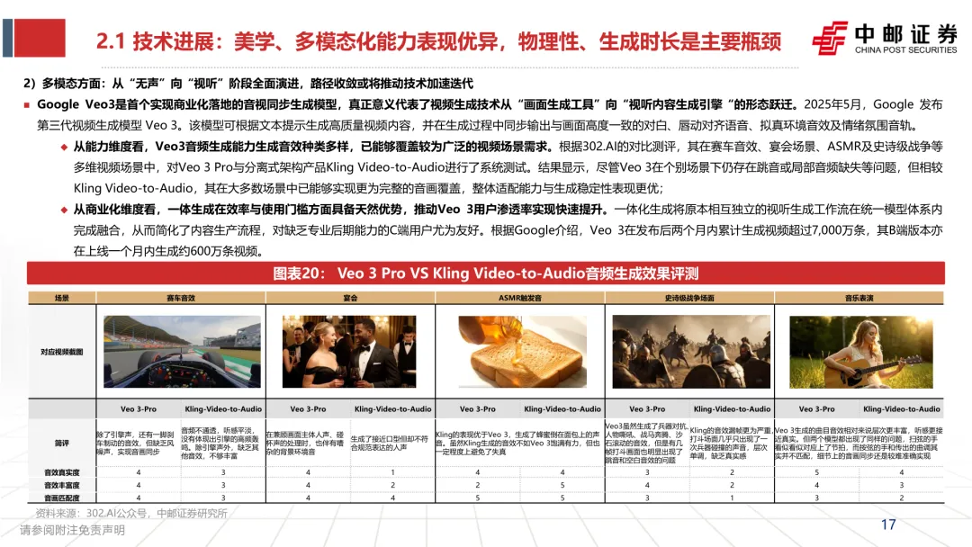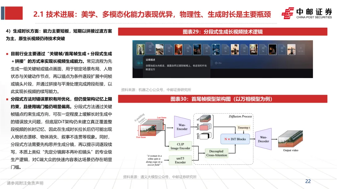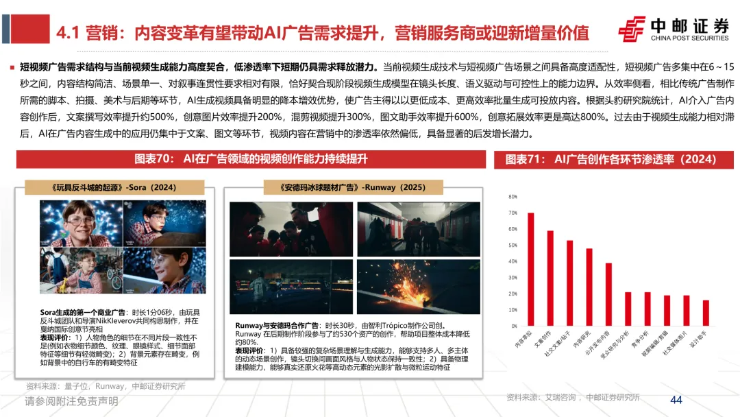 导读:报告聚焦 AI 视频行业发展态势,剖析技术跃迁与产业变革机遇。AI 视频作为 AIGC 产业能力上限的核心载体,技术路线已从 GAN、Transformer 逐步收敛至 DiT 架构,Sora 等标杆模型推动短视频生成质量接近专业水准,音画一体化成为重要演进方向。商业化呈现 C+B 端双轮驱动格局,2026 年全球市场规模预计达 2.96 亿美元。C 端以订阅模式为主,社交化探索拓宽变现路径;B 端 API 模式在电商、广告等场景成熟,影视级项目逐步落地,2026 年有望成为商业化关键节点。世界模型作为新兴技术方向,正破解长视频生成的物理一致性与时长瓶颈,为行业带来新突破。应用场景深度渗透传媒领域,广告、影视、游戏均受益显著。AI 助力广告内容批量生产,推动影视短剧降本增效,赋能游戏资产制作与玩法创新,成为内容产业生产力变革的核心引擎。