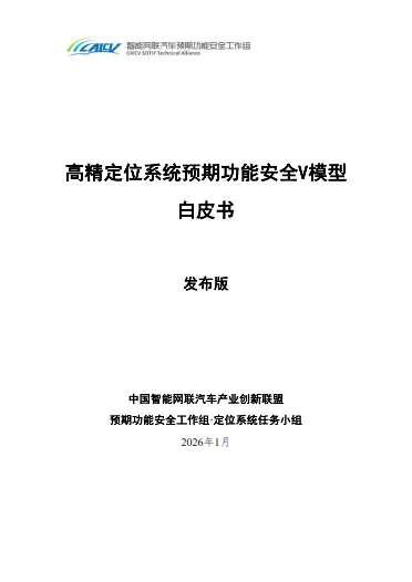 《高精定位系统预期功能安全V模型白皮书》由中国智能网联汽车产业创新联盟预期功能安全工作组·定位系统任务小组于2026年1月发布,旨在构建高精定位系统预期功能安全的标准化框架,推动技术研发与行业实践深度融合。