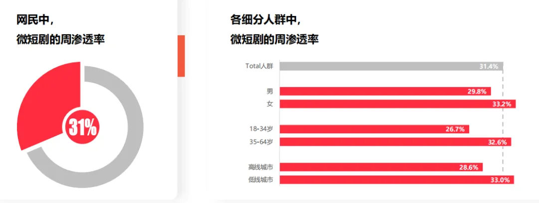 微短剧网民周渗透率达31%,女性、低线城市、35岁+人群渗透率更高,受众周均观看时长2.3小时。41%的受众有付费行为,月均付费集中在50-100元区间,付费人群以高线城市、高收入的中青年男性为主。