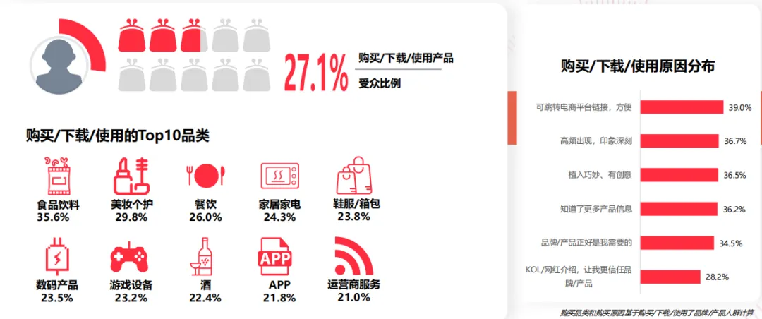 微短剧融合长剧内容植入与短视频带货双重优势,剧情植入、品牌链接的受众接受度居前,27.1%的受众会因剧中营销产生实际消费,食品饮料、美妆个护是合作核心品类。