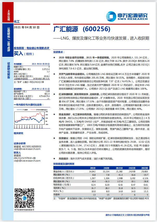 投资建议:随着公司的 LNG 接收站持续扩能,红淖铁路转固后周转加快,加之清洁炼化业务改善,进入业绩收获期。我们预计公司 2021-22 年净利润分别为 29.08、32.02 亿元(原预测分别为 21.94、27.42 亿元),新增 2023 年预测为 41.26 亿元。对应 PE 估值分别为 7、6、5 倍。我们认为未来油价仍将长期向上,公司的资源优势将会持续提升,看好公司的长期改善,维持公司买入评级。