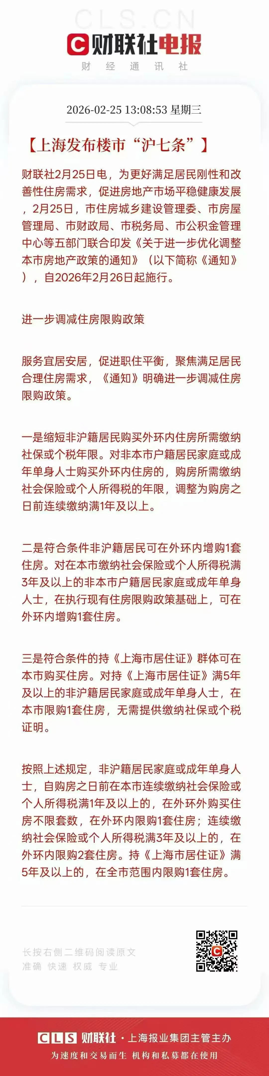 2026年2月26日起,上海市五部门联合印发的房地产新政正式施行。政策核心包括三方面:
