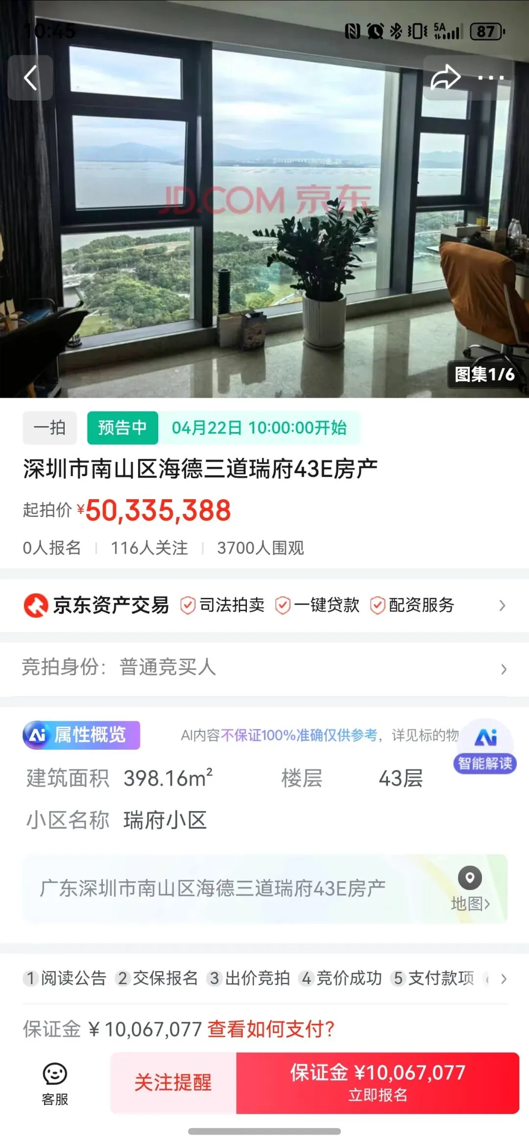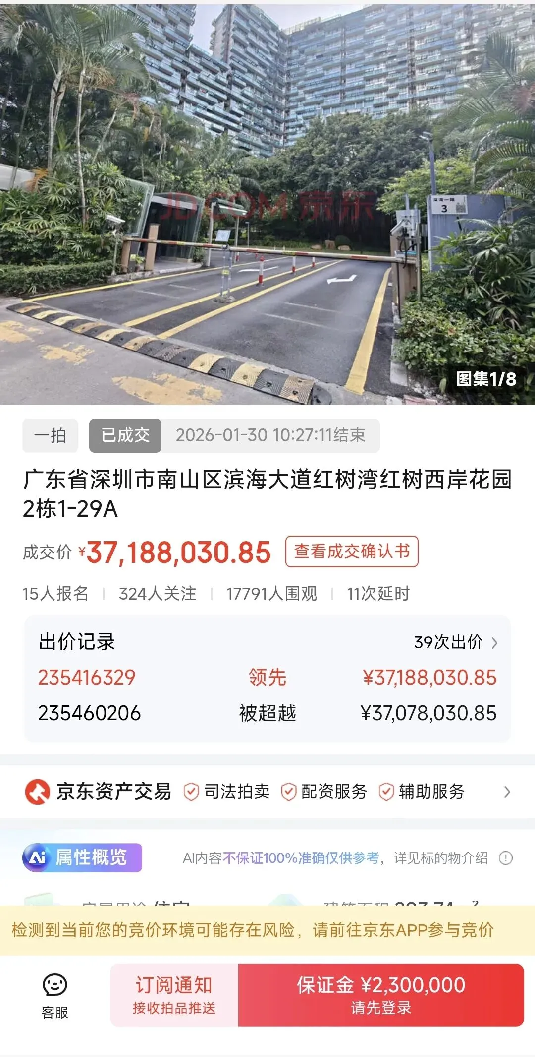 这是一次成功的司法拍卖,标的物因其优越地段和房产属性吸引了大量关注。经过多轮激烈竞价,最终以超过3700万元的价格一锤定音。