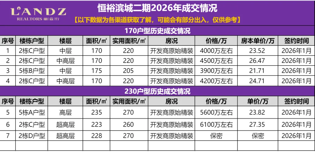 恒裕滨城二期 数据详细,显示了同户型因楼层不同产生的价差(如170㎡户型,中层与中高层单价差约3万/㎡),楼层是重要价值变量。