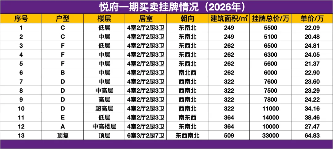 以上所有数据均为 2026年1月 成交,说明在年初该片区高端市场交易活跃,具备很强的时效参考价值。“悦府一期 1 月2月暂无成交”,在年初这一时间点,客户和资金更快速地向上述有成交的二手标杆项目集中。