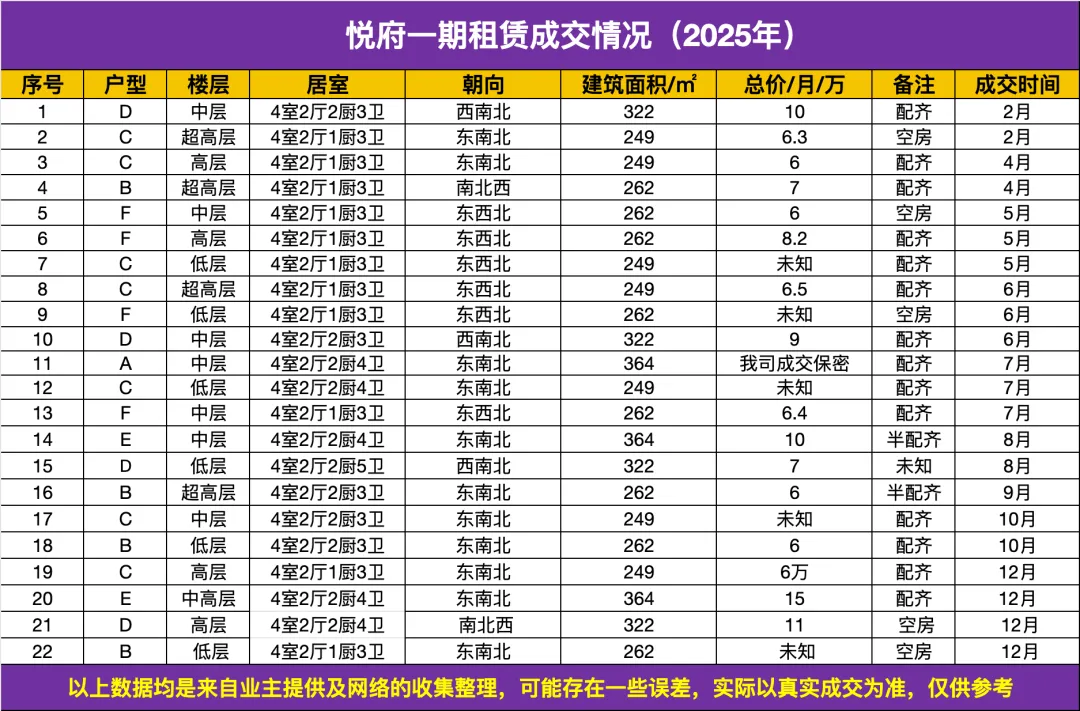 2025年全年:累计出租22套。各户型出租套数为:249㎡(7套)、262㎡(8套)、322㎡(4套)、364㎡(3套)。
