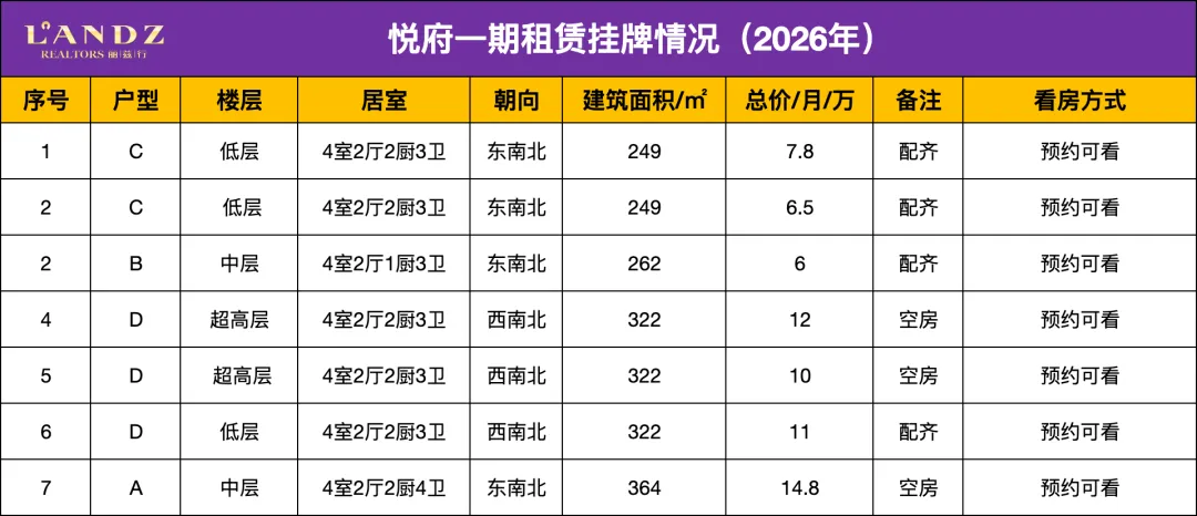 租赁房源总计挂牌7套:249㎡:2套:6.5-7.8万/月;262㎡:1套:6万/月;322㎡:3套:10万/月-12万/月;