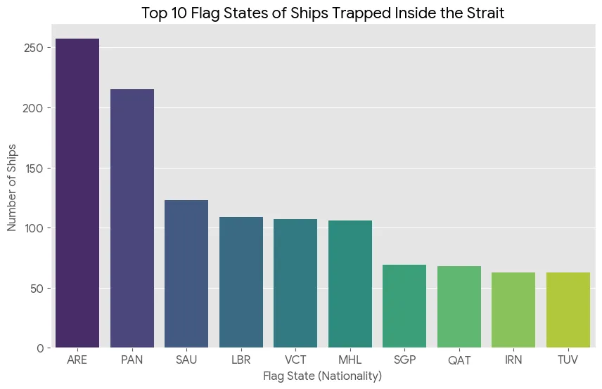 图表 2:海峡内被困船舶的“十大高危”船旗国柱状图 (Top 10 Flag States)