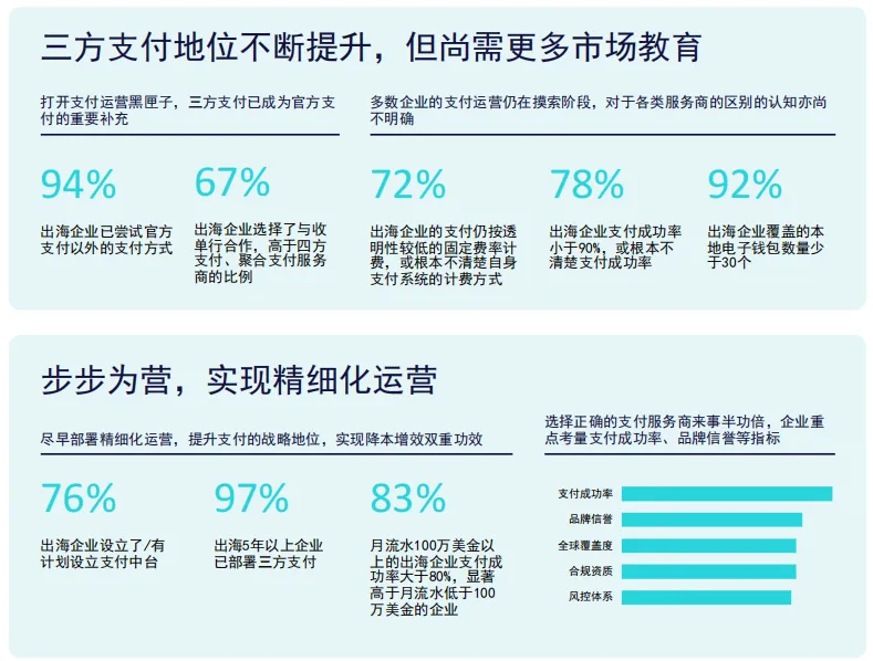 《游戏与泛娱乐出海支付白皮书》指出,中国游戏及泛娱乐出海市场规模持续增长,2023年预计达196亿美元、同比+15.8%,三方支付在成本、转化优化等方面优于平台官方支付,超7成企业三方支付占比超30%,数字钱包、本地支付成主流,支付成功率、风控与成本优化成为企业核心诉求。