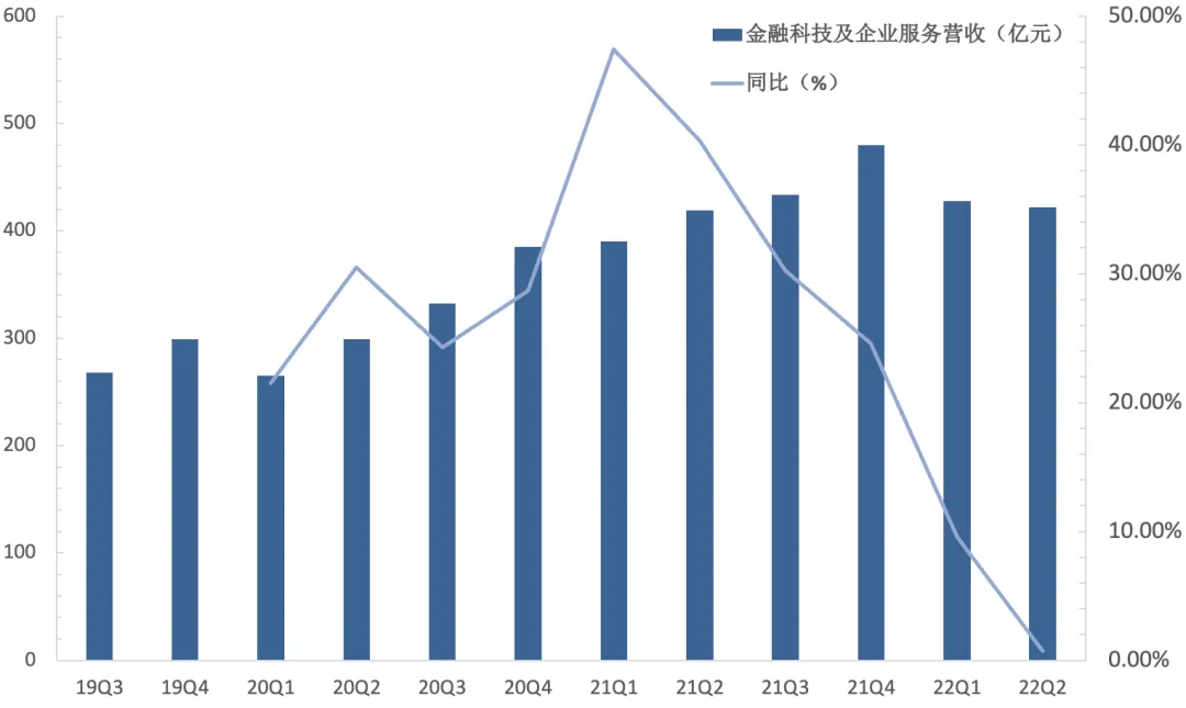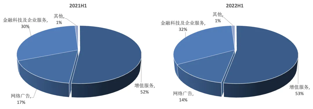 具体来看,社交及其他广告在2022Q2的收入为161亿元,同比下滑17%,主要系疫情冲击下客户的广告投放意愿降低,广告需求疲软、广告竞投量低迷,使得eCPM下滑;同期媒体广告收入为25亿元,同比下滑25%,主要由于腾讯视频、腾讯新闻的广告收入下滑所致。节奏上的变化值得关注,虽然4、5月间疫情的冲击影响甚大,但随着大型电商平台“618”大促活动的到来,各大品牌商增加了广告开支,网络广告需求得到了一定释放,腾讯网络广告业务收入在6月出现环比回升。利润方面,2022Q2网络广告业务实现毛利润75.66亿元,同比下滑32.06%,利润增速的下滑相比收入更为明显,主要系服务器与频宽成本(包括与视频号相关的成本)有所增加。腾讯的广告业务受经济环境、疫情等因素影响而收入承压,通过对广告渠道、内容成本的严格控制,驱动了广告业务的毛利率在2022Q2环比上升4pct。同时,拓展新的广告形式与新的变现渠道,将为广告业务的增长注入新动能。比如,微信广告全新推出的朋友圈出框式广告,大胆突破边界,通过惊艳视觉冲击,让品牌及产品双双破圈,总互动点击率高出大盘均值1倍多。新渠道方面,微信于7月推出视频号信息流广告,腾讯广告收入承压的现状有望随视频号商业化而得到改善。金融科技及企业服务:增速明显放缓,收入比重再提升