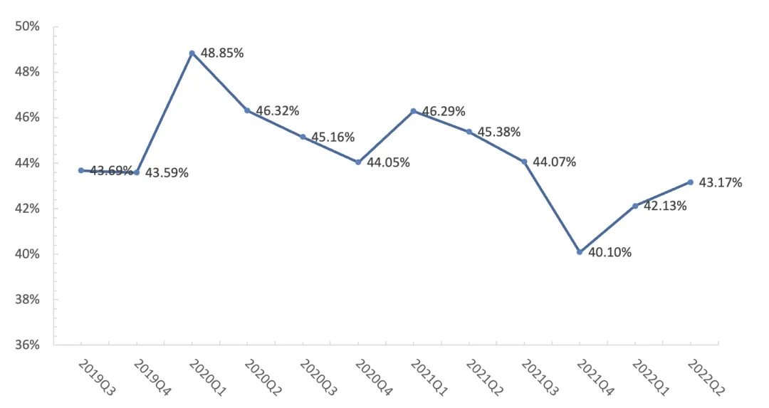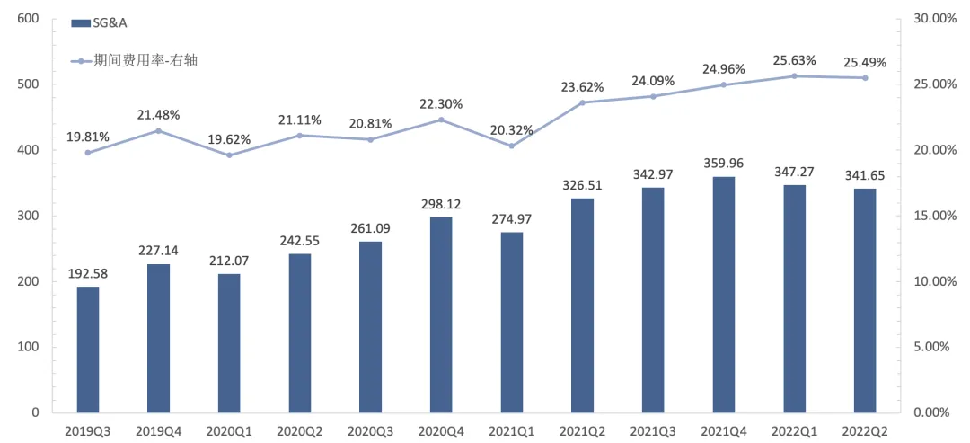 主营业务盈利能力方面,腾讯近年来的毛利率水平一直保持在40%以上,2019Q3~2022Q2间的単季毛利率中位数在44%。虽然今年以来腾讯收入增长承压,但通过一定的降本增效措施,比如对广告业务的内容成本优化、主动缩减亏损的金融与企服项目等,营业成本环比下降,毛利率则环比上升了1pct。费用方面,腾讯的期间费用支出总额(销售及市场推广开支+一般及行政开支,即SG&A)从2022Q1开始环比下行,但受到收入环比下降之影响,2022Q2的期间费用率录得25.49%,仅环比微降0.14pct。期间费用率总体保持稳定的同时,结构上的此消彼长值得关注。其中,销售及市场推广开支在2022Q2同比下降21%至79亿元,降本增效成果显著;然而,由于研发、雇员成本、办公成本等开支增加,导致一般及行政开支却同比增长16%至262亿元。