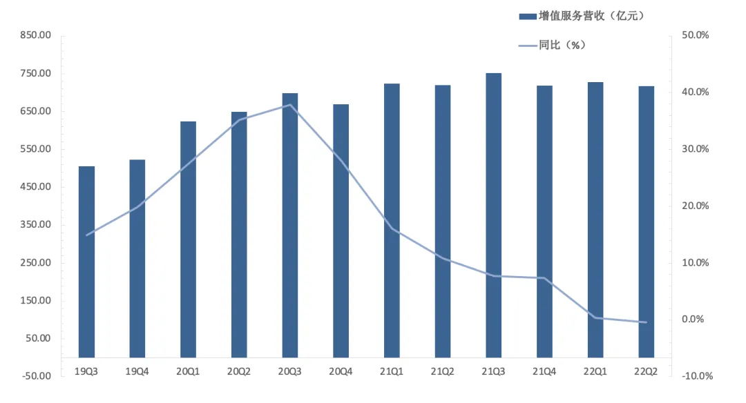 腾讯收费增值服务付费会员数在2022Q2同比增长2%至2.35亿,腾讯视频付费会员数在6月末达到了1.22亿,同期腾讯音乐付费会员数同比增长至8300万。根据QuestMobile数据,腾讯视频6月移动端日活跃账户数比最接近的同行领先20%以上,主要得益于爆款自制剧《梦华录》的较高播放量。增值服务:增速创新低,游戏难成增长动能