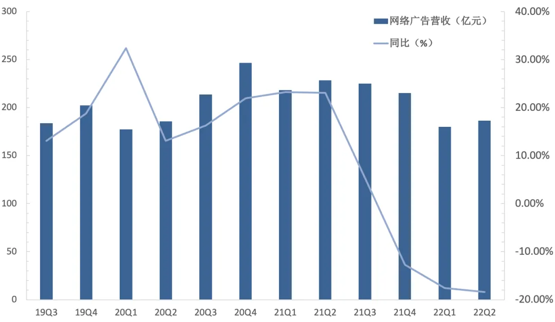 无论是游戏还是社交网络,展业创收对流量高度依赖,增长的逻辑可分为两个层次,即流量的增长和渗透率的提升。从腾讯目前的运营数据可知,流量增长对业绩的贡献在逐步减弱,所以做高付费用户的渗透率的节奏是当下腾讯业绩增长的关键。腾讯增值服务业务在2022Q2实现收入716.8亿元,同比下滑0.5%,其中,游戏业务实现收入425亿元,同比下滑1%,占总收入的38.5%;社交网络业务实现收入291.8亿元,同比增长1%,占总收入的21.8%。国内游戏业务方面,受大型游戏发布数量下降、用户消费减少以及未成年人保护措施等因素的影响,腾讯国内游戏业务在今年出现下滑。财务数据上,国内游戏业务于2022Q2实现收入318亿元,同比下降1%。从单个游戏来看,《王者荣耀》、《英雄联盟》、《天涯明月刀手游》等重磅游戏收入的同比下降是国内游戏业务疲软的核心原因。而近期推出的《英雄联盟手游》、《重返帝国》、《金铲铲之战》等新游戏的收入增长,部分对冲了国内游戏业务收入的下滑。海外游戏业务方面,受疫情限制措施放松、消费者减少游戏支出等因素影响,在全球游戏市场收入下滑的大背景下,腾讯亦未能幸免。2022Q2,腾讯在国际市场游戏实现收入107亿元,同比下降1%,主要系《PUBG Mobile》、《荒野乱门》等游戏收入减少的拖累。社交网络业务中,由于视频号直播服务的收入增加,与音乐直播及游戏直播的收入减少实现了对冲,该业务在今年上半年表现平稳。经营数据上,腾讯的收费增值服务付费会员数达2.35亿,同比增长2%。其中,腾讯视频付费会员数达1.22亿,腾讯音乐付费会员数同比增长至8300万。从盈利能力来看,增值服务业务实现毛利率50.6%,同比下降2.34pct,主要系视频号直播服务相关的收入分成、《VALORANT》电子竞技赛事制作、服务器与频宽等成本项的增加对毛利率造成拖累。目前来看,增值服务作为腾讯的核心业务,在诸多内外因素的作用下,游戏业务正处于瓶颈期;视频号相关业务虽有所增长,但还要面对目前宏观环境下,付费用户付费意愿降低导致的订阅收入下降。网络广告:需求短期承压,收入明显下滑