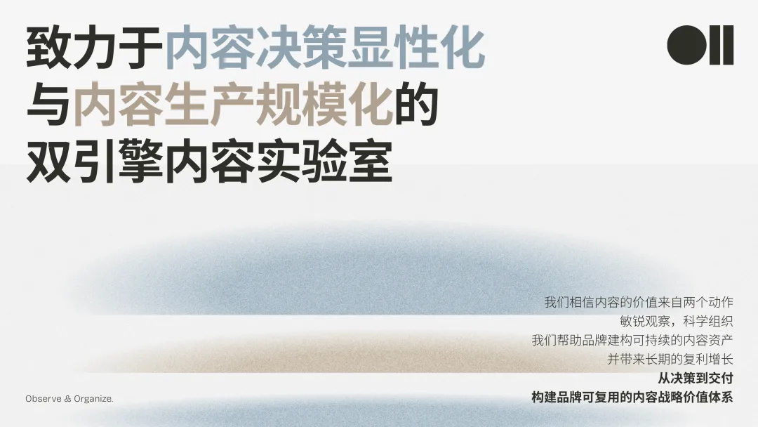 O2 Lab 是一个围绕「内容决策显性化」与「内容生产规模化」运作的双引擎内容实验室。我们相信,内容的长期价值并不来源于一次次灵感迸发,而来源于两个可以被反复验证与放大的动作:敏锐观察,与科学组织。