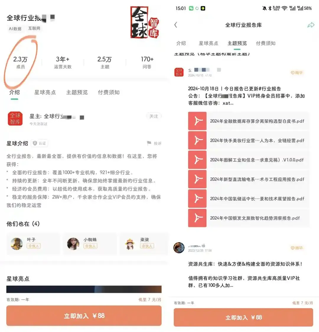 有人直接收集整理这些报告,打包在知识星球按年收费,88一年随便下,卖给了2.3万人,运营三年,直接收入200w+,算下来月入5w+