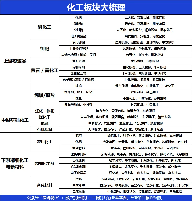 上游资源类 | 提供“食材”(矿产资源) | 靠资源稀缺性取胜 | 磷矿、钾肥、萤石、纯碱/原盐 |