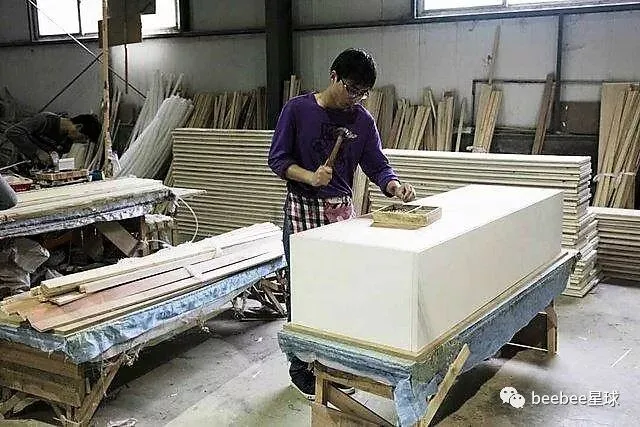 售价8万日元一个的棺材档次很高,生产流水线也非常规范化。