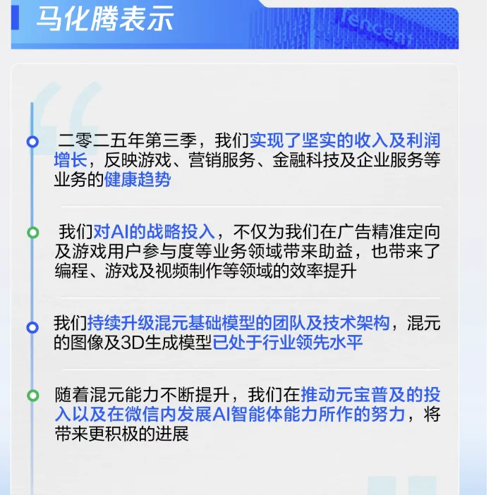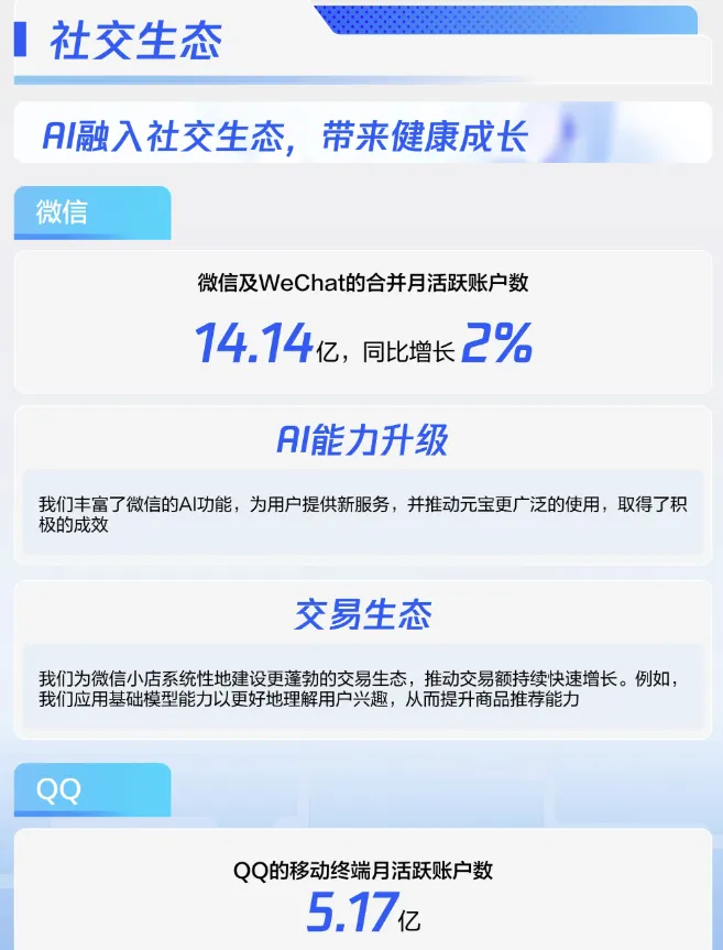 第三,微信生态:微信小店交易额快速增长;AI 功能与元宝使用扩大;月活跃账户数小幅增长(微信+1.4%,QQ‑8%)。
