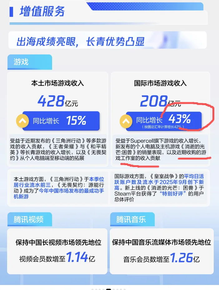 国际市场游戏收入208亿元,同比+43%(按固定汇率计算为42%),主因近期收购的游戏工作室的收入贡献,以及新发布的个人电脑及主机游戏《消逝的光芒:困兽》的销量表现;