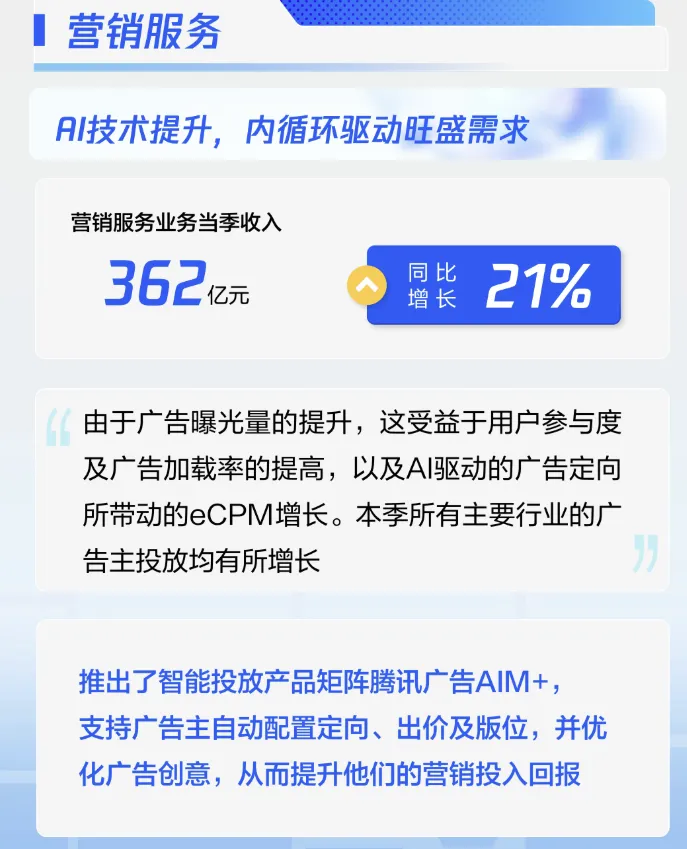 2、营销服务(广告、视频号等)占比约 19%,收入362亿元,同比增长 21%,毛利率57%,主因视频号及微信搜一搜营销服务等高毛利率收入增加【该增长乃由于广告曝光量的提升,这得益于用户参与度及广告加载率的提高,以及AI驱动的广告定向所带动的eCPM增长。本季所有主要行业的广告主投放均有所增长】