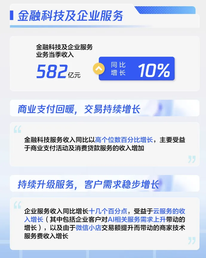 3、金融科技及企业服务(支付、云、AI 等)占比约 30%,收入582亿元同比增长 10%。毛利率50%,主因金融科技服务收入结构改善及云服务成本效益提升【金融科技服务收入同比以高个位数百分比增长,主要受益于商业支付活动及消费贷款服务的收入增加。企业服务收入同比增长十几个百分点,受益于云服务的收入增长(其中包括企业客户对AI相关服务需求上升带动的增长),以及由于微信小店交易额扩大而带动的商家技术服务费收入增长】