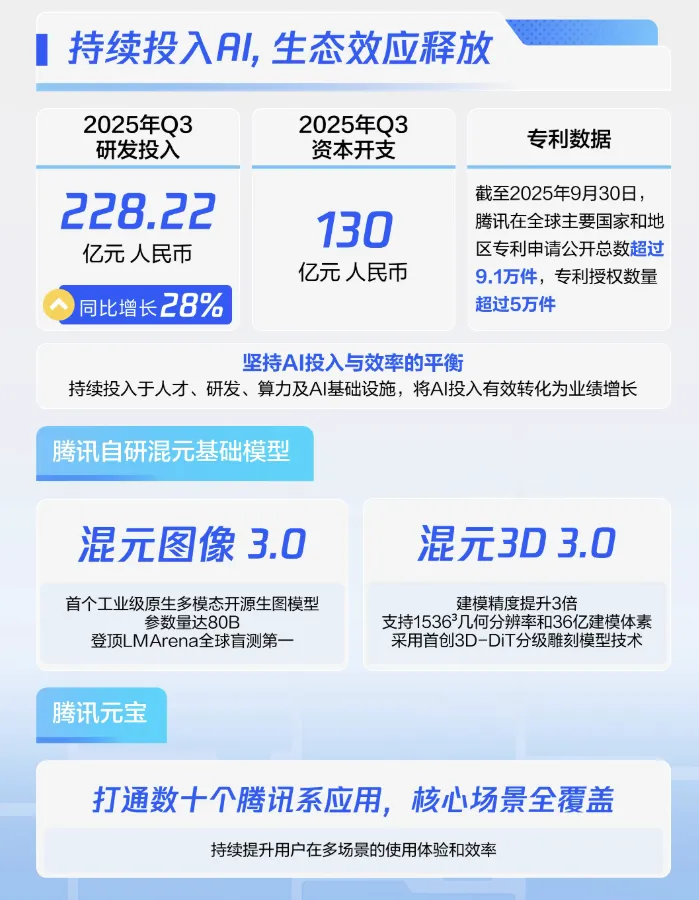 第二,AI 战略:混元大模型持续升级,图像/3D 生成居行业领先;AI 助力广告精准投放、游戏用户参与度提升及内容制作效率【资本支出:截至 2025 年 9 月末资本支出 129.83 亿元,主要用于 AI 相关投入】