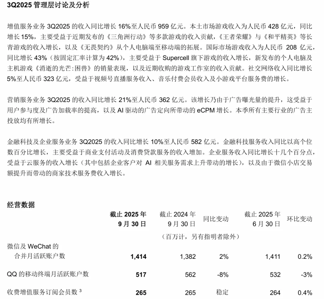 腾讯:2025年Q3业绩收入