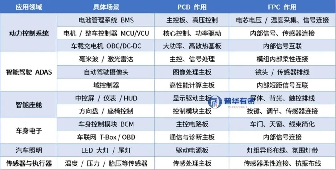 PCB/FPC在汽车电子的应用场景示例表