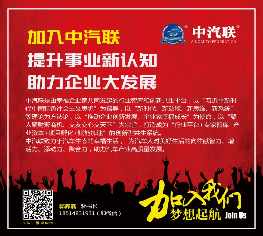 中汽联 是由创新企业和幸福企业家共同发起的行业智库和创新共生平台,以“习近平新时代中国特色社会主义思想”为指导,以“新时代、新动能、新思维、新系统”等理论为方法论,以“推动企业创新共生、企业家幸福成长”为使命,以“聚人聚财聚商机、交友交心交天下”为宗旨,推动企业升级和企业家幸福成长,打造成为“中国汽车产业大脑”,为汽车人对美好生活的向往献智力、增活力、添动力、聚合力,助力汽车产业高质量发展。