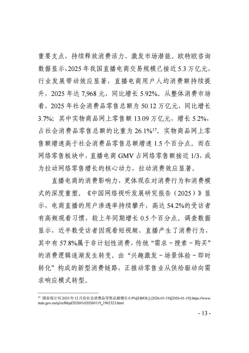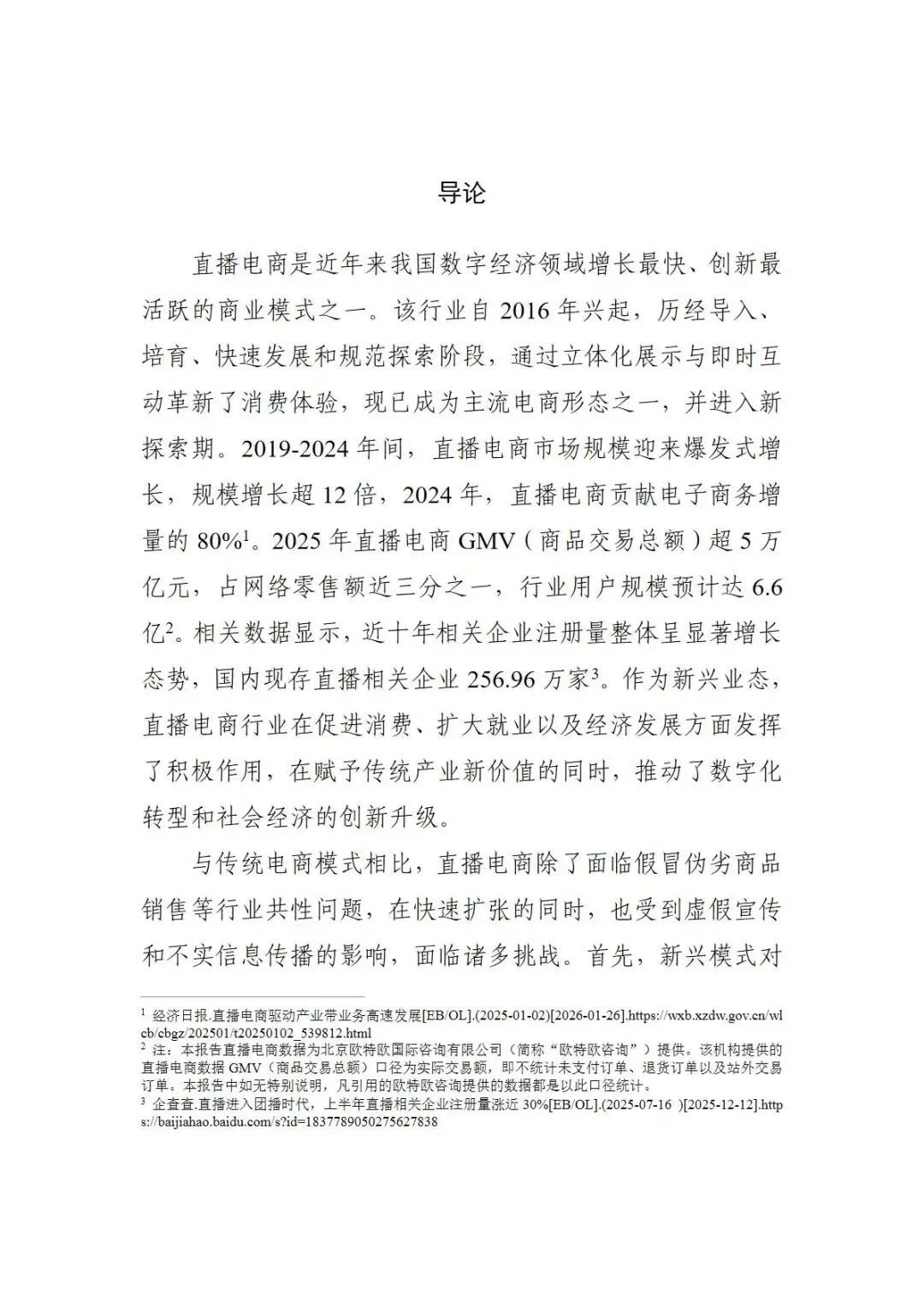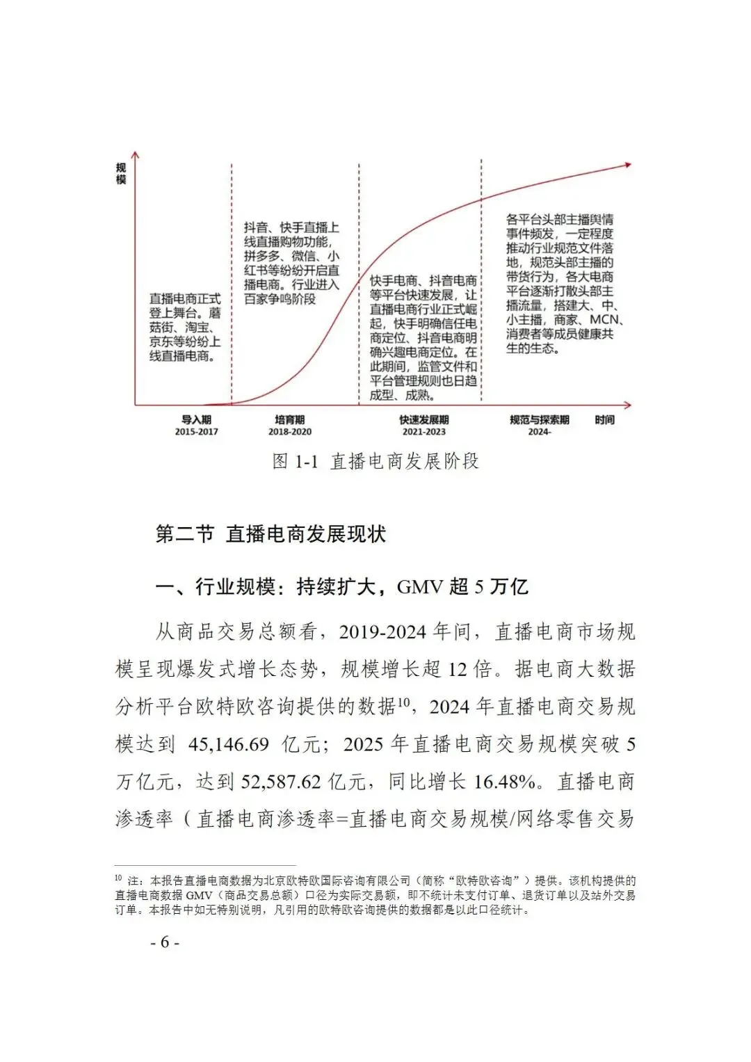 直播电商作为我国数字经济领域极具活力的商业模式,自2016年兴起后历经多阶段发展,已成为主流电商形态。2019-2024年行业市场规模增长超12倍,2025年GMV突破5万亿元、占网络零售额近三分之一,用户规模达6.6亿,在促进消费、推动产业数字化转型中发挥重要作用。同时,行业快速发展也伴随内容治理难、供应链品控弱、主体责任界定模糊、复合型主播稀缺等问题。近年来,政府、平台、行业协会等多方协同推进治理,政策体系不断完善,平台治理机制持续优化,行业自律与社会监督逐步形成,消费者投诉增幅收窄,商品质量与行业公信力稳步提升。当前行业迈入规范与多元发展新阶段,呈现治理体系协同化、主播职业化、品牌店播常态化、中小主体成为市场主导的特征,未来需通过压实各方责任、强化差异化治理、构建长效协同治理生态,推动行业实现高质量、可持续发展。