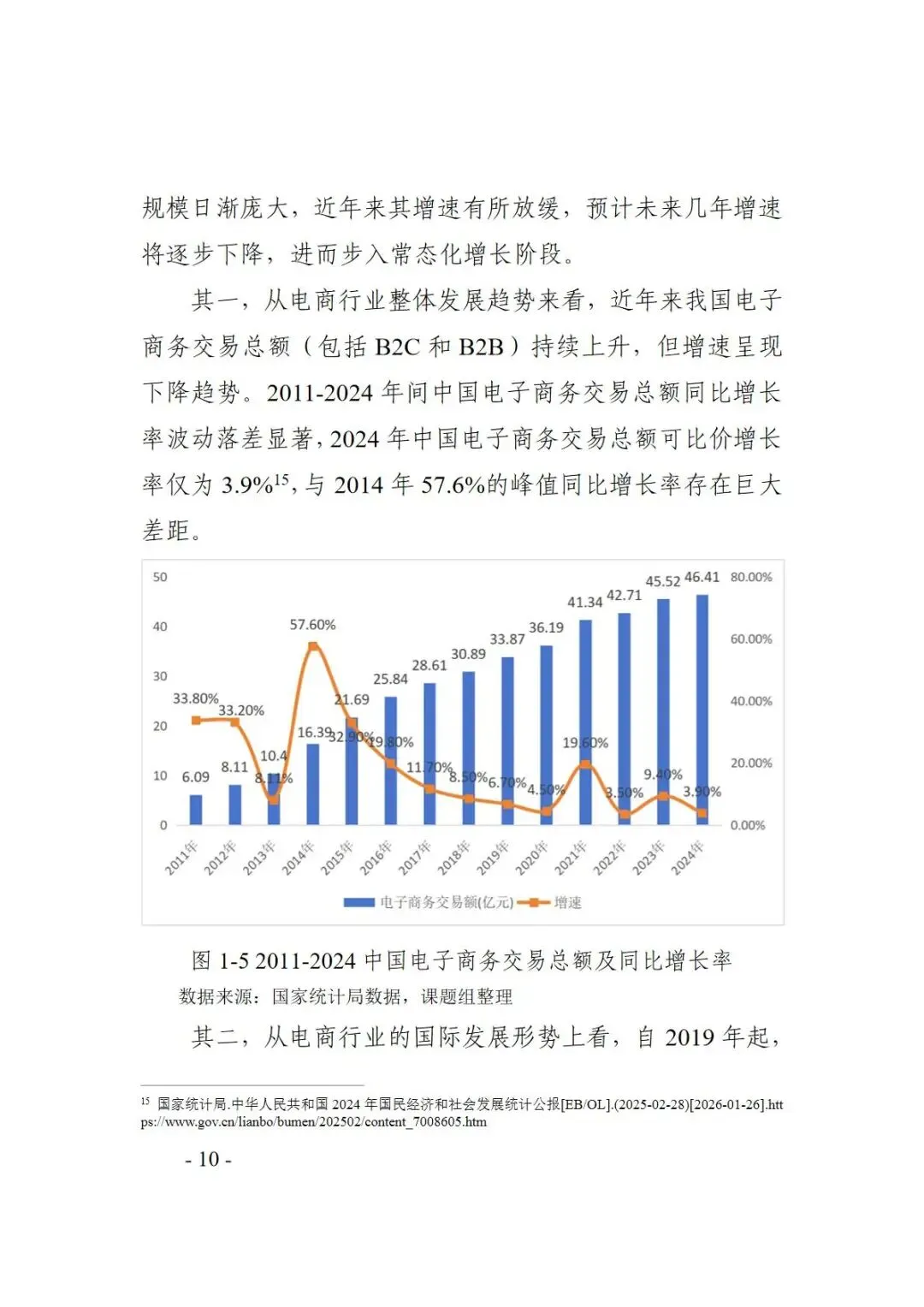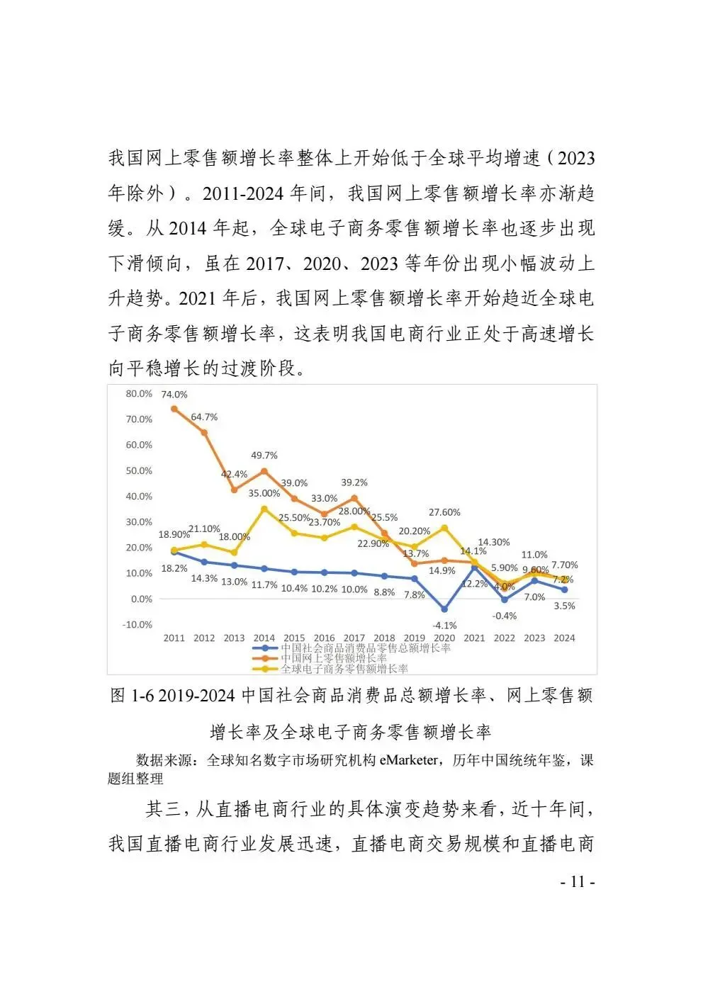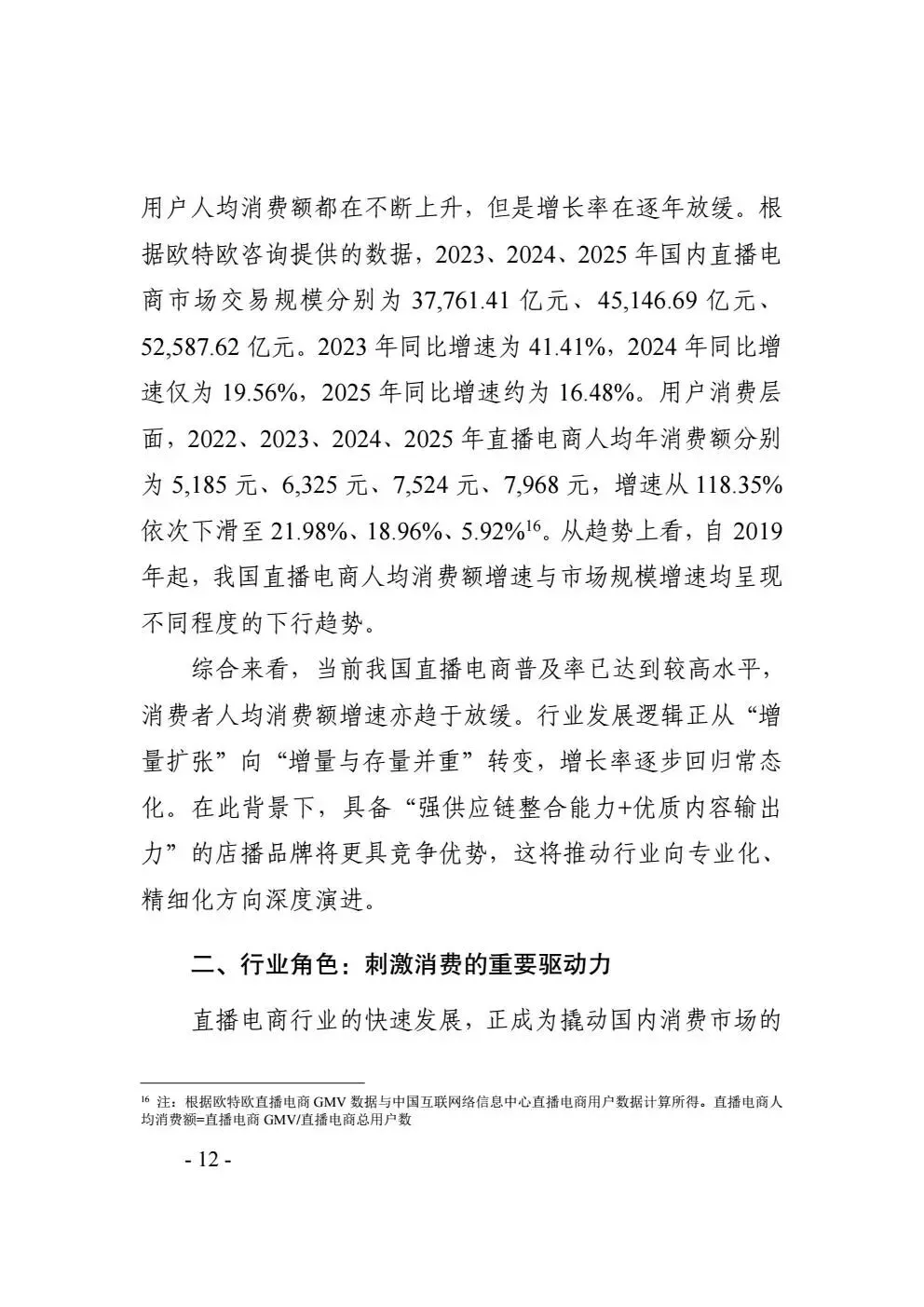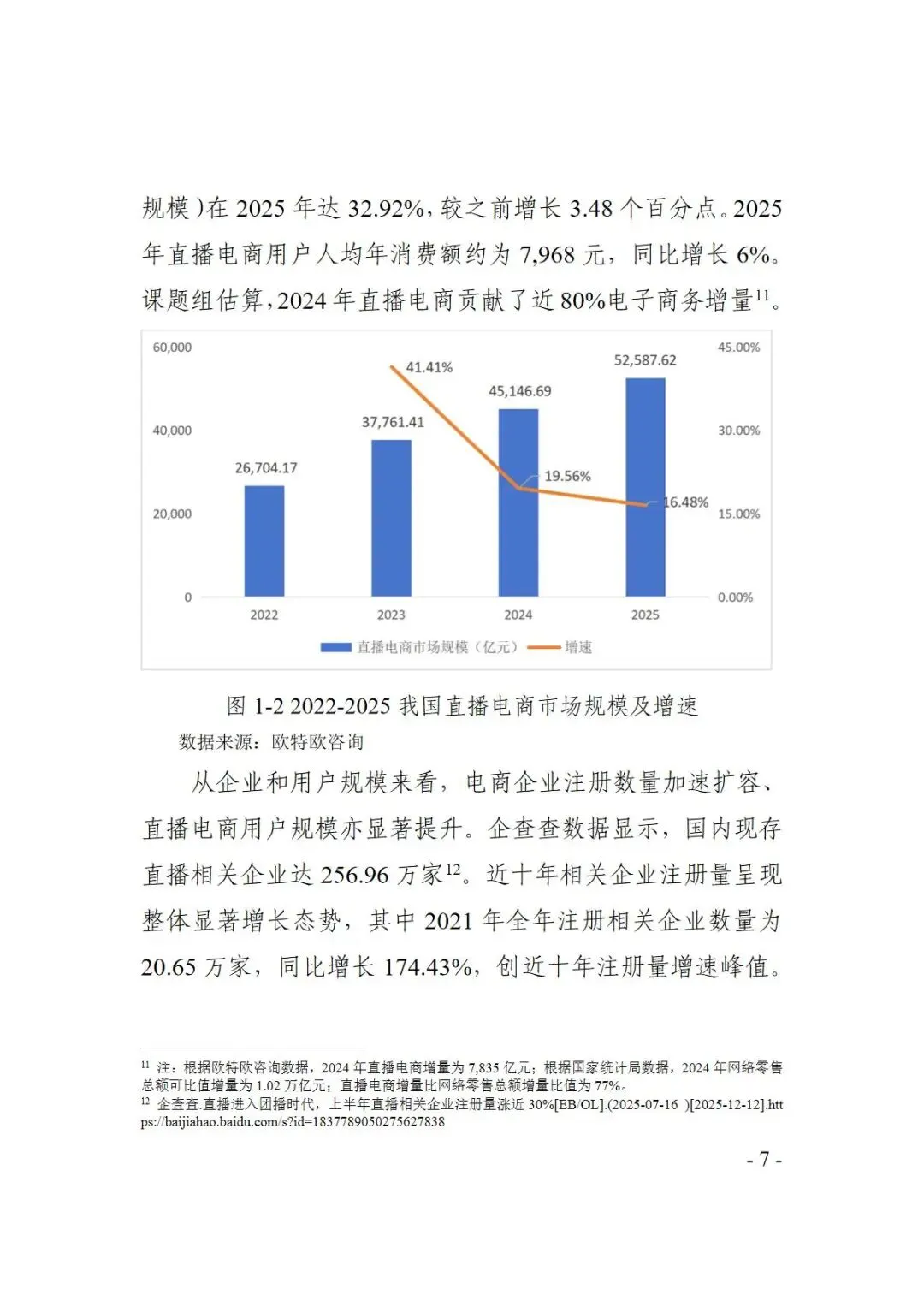 直播电商作为我国数字经济领域极具活力的商业模式,自2016年兴起后历经多阶段发展,已成为主流电商形态。2019-2024年行业市场规模增长超12倍,2025年GMV突破5万亿元、占网络零售额近三分之一,用户规模达6.6亿,在促进消费、推动产业数字化转型中发挥重要作用。同时,行业快速发展也伴随内容治理难、供应链品控弱、主体责任界定模糊、复合型主播稀缺等问题。近年来,政府、平台、行业协会等多方协同推进治理,政策体系不断完善,平台治理机制持续优化,行业自律与社会监督逐步形成,消费者投诉增幅收窄,商品质量与行业公信力稳步提升。当前行业迈入规范与多元发展新阶段,呈现治理体系协同化、主播职业化、品牌店播常态化、中小主体成为市场主导的特征,未来需通过压实各方责任、强化差异化治理、构建长效协同治理生态,推动行业实现高质量、可持续发展。