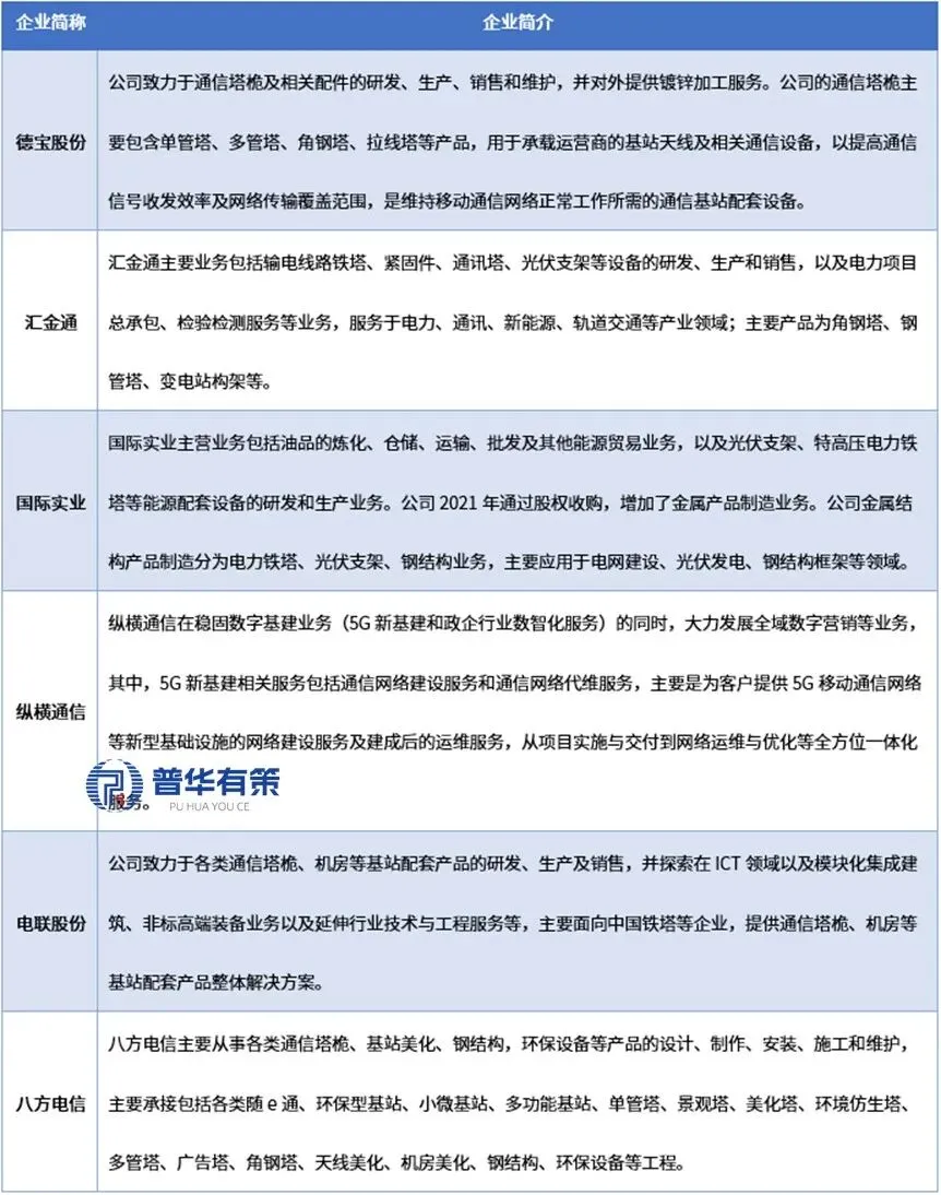 目前,国内规模较大的通信铁塔制造企业主要有德宝股份、汇金通、国际实业、纵横通信、电联股份、八方电信等。