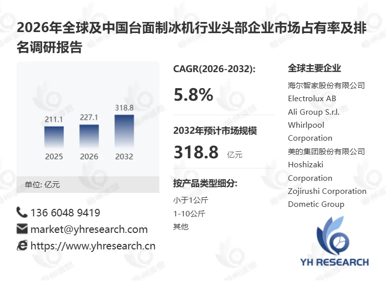 根据YH恒州诚思信息咨询调研统计,2025年全球台面制冰机市场规模约211.1亿元,预计未来将持续保持平稳增长的态势,到2032年市场规模将接近318.8亿元,未来六年CAGR为5.8%。