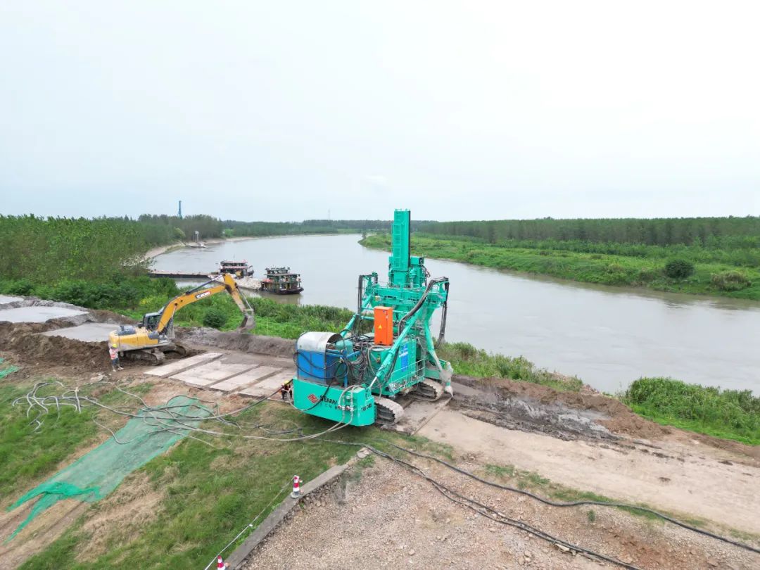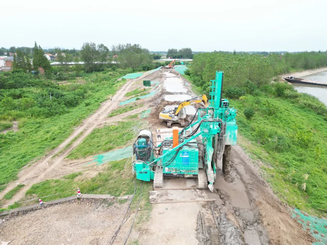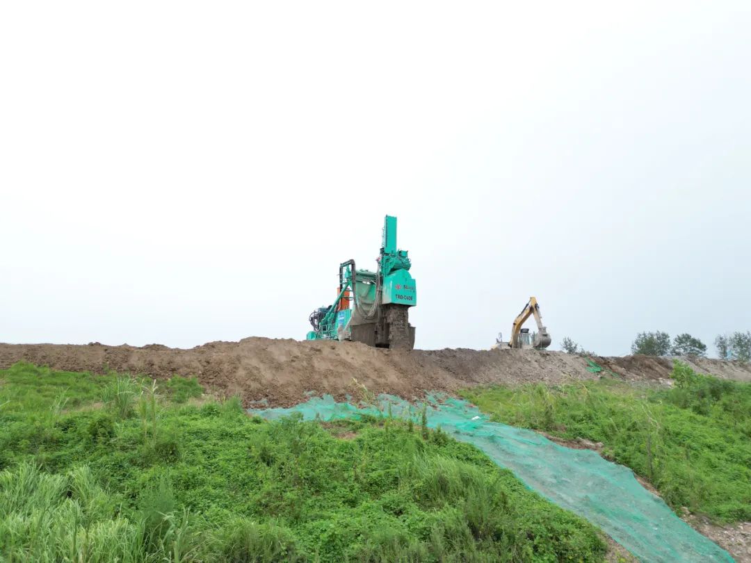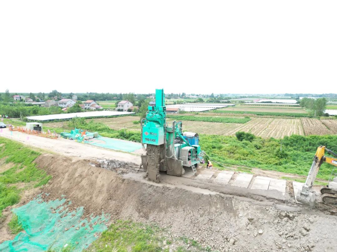 上工机械首台纯电驱动TRD-C40E工法机完成下线后,首次出征,直抵洞庭湖区松遭烷一线防洪大堤,在窄小的堤坝上进行深度32m,墙厚550mm的多段止水帷幕连续墙施工。实地现场,TRD-C40E工法机凭借着优异的实战表现成为大堤上一道亮丽的风景线。