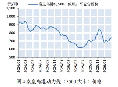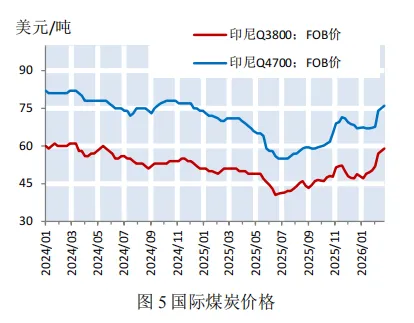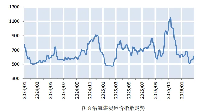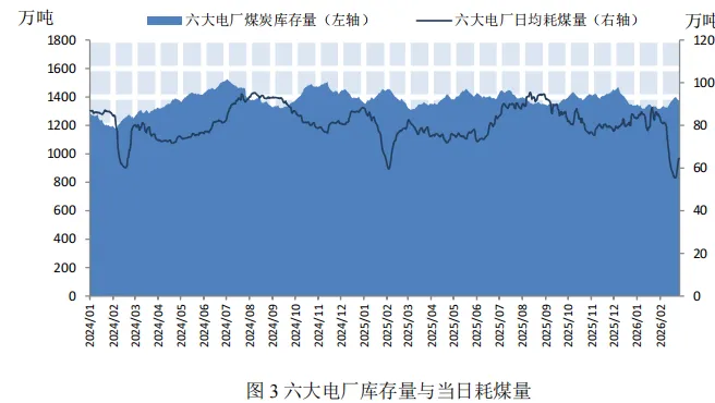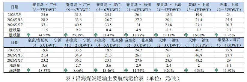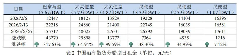 市场综述:沿海干散货运价指数小幅上涨,散货船日租金指数大幅回升上海航运交易所2026年2月27日发布的中国沿海干散货运价指数报收于919.57点,较2月6日小幅上涨2.2%(如图1)。三大货种方面均呈上涨态势,其中煤炭运价涨幅最大(如表1)。上海航运交易所2026年2月27日发布的中国沿海散货船日租金指数(CDI)报收于1293.1点,较2月6日大幅回升134.2%(如图2)。各船型租金均呈大幅回升态势,其中巴拿马型(7.6万DWT)大幅上涨347.63%至55717元/天;大灵便型(5.7万DWT)大幅上涨164.94%至48025元/天(如表2)。截至2月27日,沿海六大电厂的存煤量为1375.1万吨,较上期末小幅上涨2.92%;日均耗煤量为64.53万吨,较上期末下降20.89%,受春节长假影响,呈现先降后升走势;可用天数维持在21.3天左右,较上期增加5天(如图3)。供给:国内煤价小幅上涨,国外煤价大幅上涨