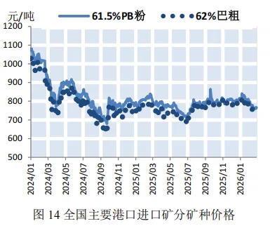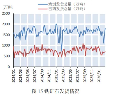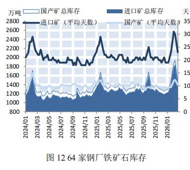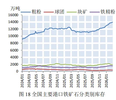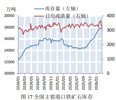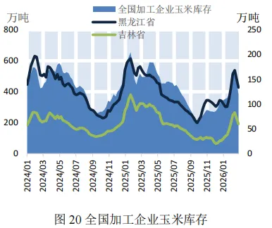 本期,钢材价格微幅下降。截至2月27日,普钢综合指数(绝对价格指数)报收于3405.95点,较上期微幅下降0.24%(如图9)。钢厂盈利率报收于39.83%,较上期微幅上涨0.44%(如图10)。本期,钢厂高炉开工率微幅上涨。截至2月27日,全国调研的247家钢厂高炉开工率为80.22%,较上期微幅上涨0.69%(如图11)。本期,全国64家钢厂进口矿库存和国产矿库存均呈下降态势。截至2026年2月27日,全国调研的64家钢厂进口矿库存1368.16万吨,进口矿平均可用天数23天,较上期减少8天;国产矿库存81.54万吨,国产矿平均可用天数10.44天,较上期减少1.57天(如图12)。国产矿方面,本期国产矿价格小幅下降。截至2月27日,霍邱地区65%造球精粉价格指数报收于921点,较上期下降26点(如图13);进口矿方面,本期进口矿价格小幅下降。截至2月27日,61.5%PB粉报收于766元/吨,较上期下降11.5元/吨;62%巴粗报收于744元/吨,较上期下降12元/吨(如图14)。截至2月27日,澳洲发货总量1803.1万吨,环比上涨187.2万吨;巴西发货总量102.5万吨,环比上涨1.9万吨(如图15)。截至2月27日,全国186矿山样本产能利用率为55.34%,较上期小幅下降2.68个百分点(如图16)。本期,全国主要港口铁矿石库存小幅下降,日均疏港量大幅下降。截至2月27日,全国主要港口铁矿石库存17891.3万吨,较上期减少23.38万吨,日均疏港量313.53万吨,较上期大幅下降12.32%(如图17)。按品种分类,粗粉库存13942.74吨,较上期增加190.02万吨;球团库存377.73万吨,较上期减少32.48万吨;块矿库存1979.57万吨,较上期减少129.65万吨;铁精粉库存1591.26万吨,较上期减少51.27万吨(如图18)。预测:铁矿石运价小幅上涨,预计下期运价震荡偏强运行本期,春节后钢厂逐步复产带动矿石需求释放,日均铁水产量小幅上涨,叠加北方港口受天气影响导致船舶周转效率下降,沿海金属矿石运价小幅上涨。截至2月27日,上海航交所发布的中国沿海金属矿石运价指数报收于625.68点,较上期小幅上涨1.05%(如图19)。各航线运价涨跌各异,其中青岛/日照-张家港(2-3万DWT)航线运价小幅上涨2.52%至24.4元/吨(如表4)。下期,钢厂节后复产带动铁水产量温和回升对运价形成支撑,但受钢厂利润偏弱影响,采购以按需补库为主,运价上行空间有限,预计下期各航线运价震荡偏强运行。供需:加工企业玉米库存大幅下降,北方港口玉米价格小幅上涨