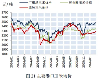 本期,加工企业玉米库存大幅下降。截至2月27日,全国加工企业玉米库存385.2万吨,较上期大幅减少127.5万吨(如图20)。本期北方玉米市场价格小幅上涨。截至2月27日,广州港玉米价格为2490元/吨,较上期(2月6日)增加50元/吨,鲅鱼圈玉米价格为2365元/吨,较上期增加35元/吨,潍坊玉米价格为2290元/吨,较上期增加20元/吨(如图21)。港口:北方港口下海量大幅下降,南方港口内贸库存小幅上升