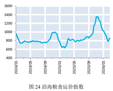 本期,北方港口下海量大幅下降,南方港口内贸库存小幅上升。本期(2026年2月7日—2026年2月27日)北方四港玉米下海量共计58.1万吨,较上期(2026年1月24日—2026年2月6日)减少83.1万吨;广东港口内贸玉米到货量为64.3万吨,较上期减少23.1万吨;外贸玉米到货量为8.8万吨,较上期上涨8.8万吨(如图22)。截至2月27日,广东港口内贸玉米库存61.9万吨,较上期上涨3.7万吨;外贸玉米库存15.7万吨,较上期上涨3.5万吨(如图23)。本期,玉米价格呈小幅上涨,加工企业玉米库存减少,贸易商出货积极性增加,叠加船舶运力供应偏紧,沿海粮食运价小幅上涨。截至2月27日,上海航交所发布的沿海粮食运价指数报收于856.86点,较上期上涨3.9%(如图24)。各航线运价均呈上涨态势,其中大连/锦州-广州(5-6万DWT)运价上涨4.73%至44.3元/吨(如表5)。下期,节后深加工、饲料企业复工补库带动北方港口集港量逐步回升,但由于基层余粮有限,预计下期沿海粮食运价延续小幅上行走势。