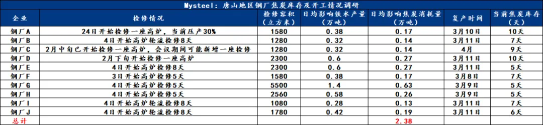 据了解,近期唐山市场焦钢企业已接到全国重要会议期间临时自主减排通知,要求企业在3月4日—3月11日执行阶段性减排管控。钢厂端,高炉负荷按不低于30%比例自主减排,并由企业结合自身装备、生产与原料库存情况,制定专项减排执行方案,按要求上报备案。据调研,目前多数钢厂已计划高炉压产30%,烧结限产30%-50%,部分钢厂已有高炉检修计划,检修时长多数在5-7天,预计3月上旬唐山市场高炉铁水呈现下滑,到中旬则会恢复,整体影响量较为有限。以下是部分重点钢厂高炉检修计划调研,多数钢厂4号开始检修,11日左右复产,高炉压产30%;据初步测算,检修期间钢厂日均影响焦炭消耗量约2万吨,多数检修时间较短,影响较为有限。