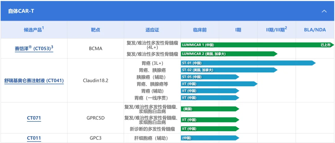 CT0590是一种利用THANK-uCAR®技术靶向BCMA的通用型CAR-T细胞候选产品。在中国已经启动一项研究者发起的临床试验,旨在评估CT0590治疗复发或难治性多发性骨髓瘤的安全性和疗效。CT0590 IIT概念验证研究结果已于2024年12月在第66届ASH年会上进行展示,标题为「CT0590:一种靶向BCMA和NKG2A的三重基因敲除异体CAR-T细胞疗法在复发/难治性多发性骨髓瘤患者中的首次人体研究」。