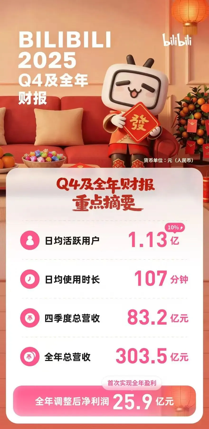 北京时间2026年3月5日(美东时间2026年3月5日),哔哩哔哩(NASDAQ: BILI,HKEX:9626;以下简称“B站”)公布了截至2025年12月31日第四季度及全年未经审计的财务报告。财报显示,B站第四季度总营收达83.2亿元人民币,同比增长8%,净利润同比提升478%;全年总营收达303.5亿元,同比增长13%;调整后净利润25.9亿,实现全年盈利。
