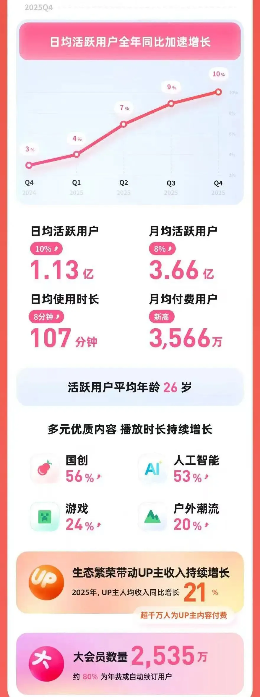 2025年,B站活跃用户数连续四个季度同比提速增长。四季度日均活跃用户达1.13亿,同比增长10%;月均活跃用户达3.66亿,同比增长8%;日均使用时长也提升至107分钟,同比增长8分钟。